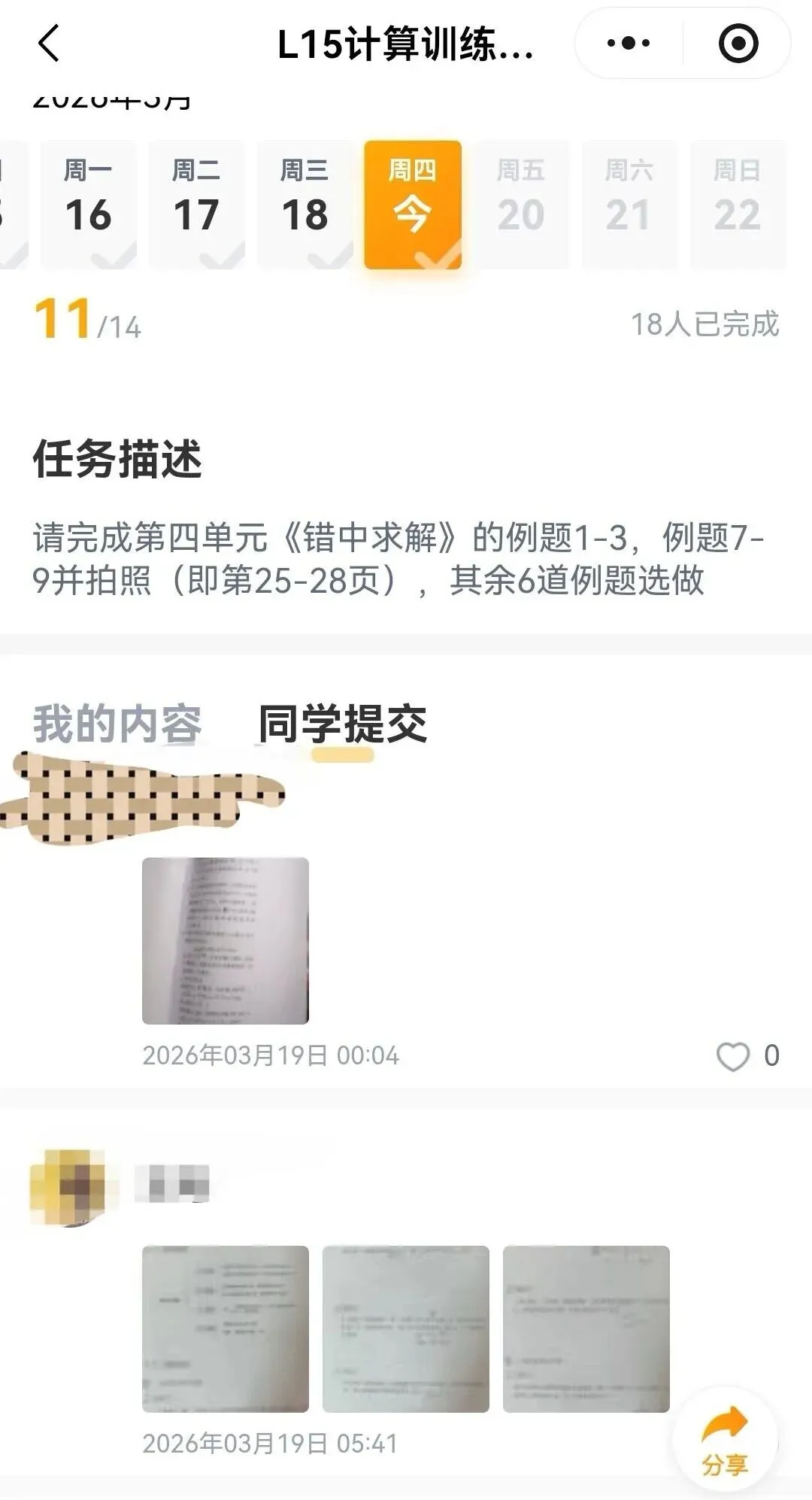 “妈妈,你看这第一个打卡的人,他在00:04就打卡了,但是他传的打卡照片根本不是这次乐读计算打卡的题啊!”
