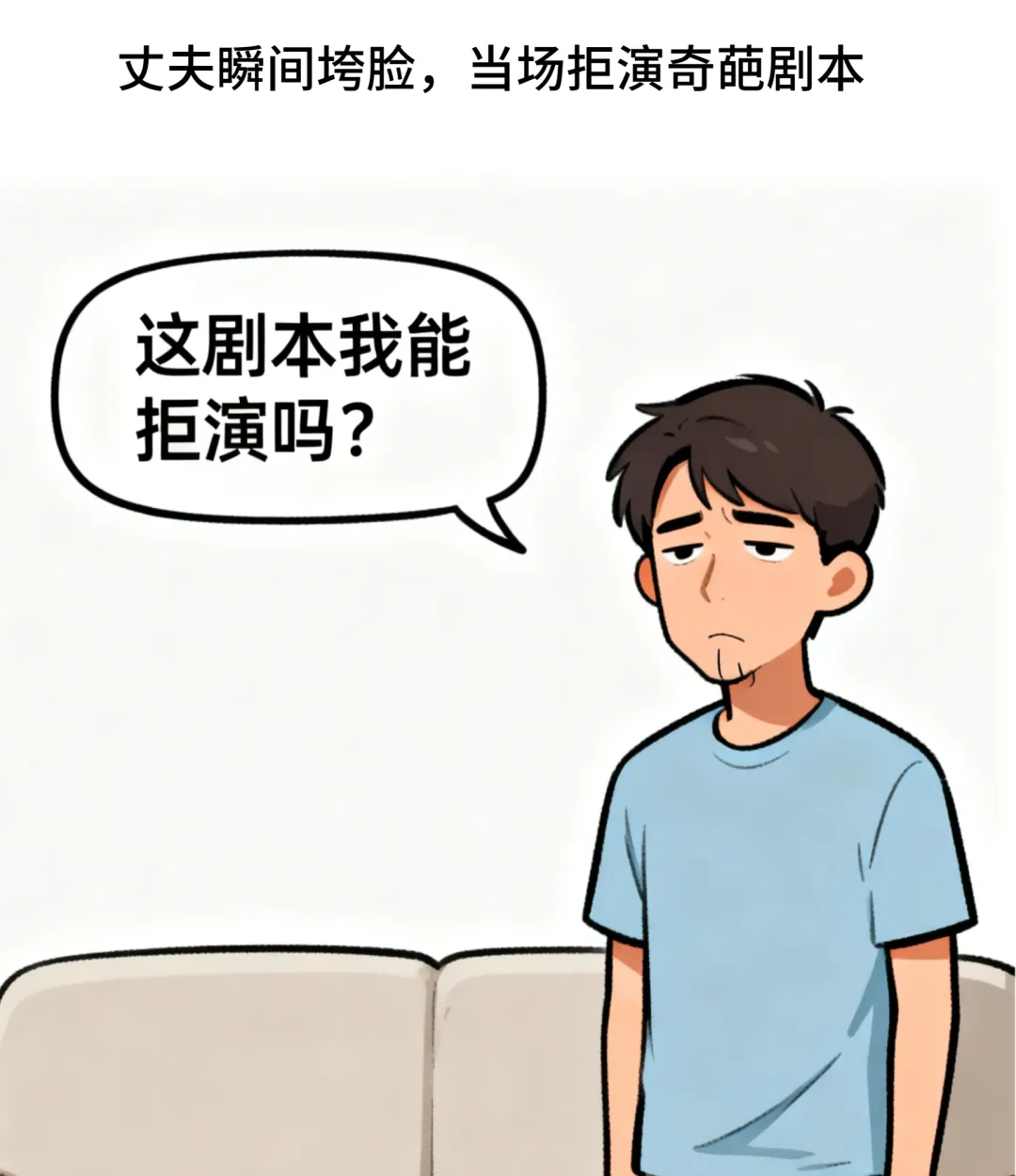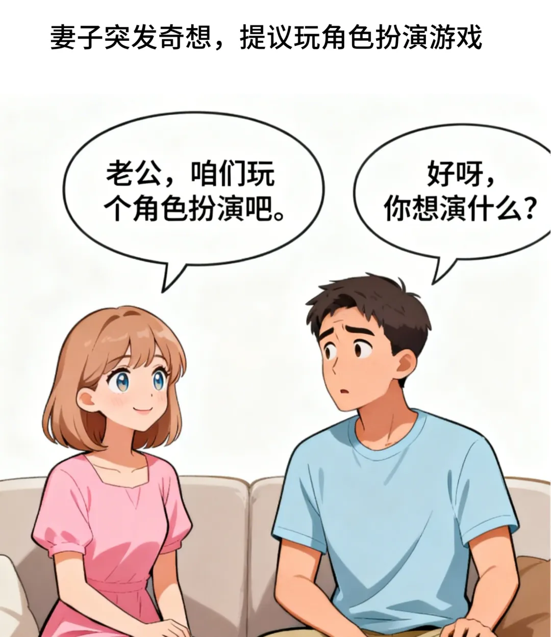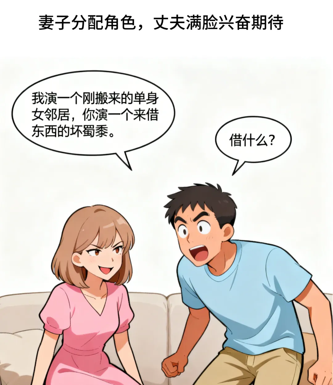 趣味漫画:妻子:老公,咱们玩个角色扮演吧.丈夫:好呀,你想演什么?妻子:我演一个刚搬来的单身女邻居,你演一个来借东西的坏蜀黍..