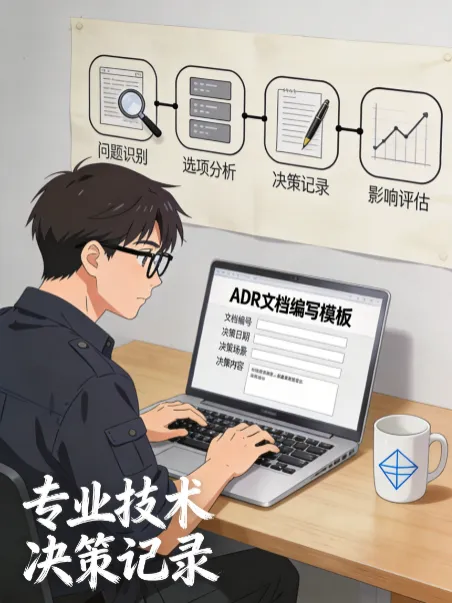 架构师在电脑前编写ADR文档,背景中有决策流程图,包含问题识别、选项分析、决策记录、影响评估等步骤。