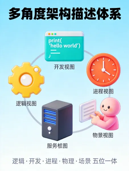 五个相互关联的视图图标:逻辑视图(齿轮)、开发视图(代码)、进程视图(时钟)、物理视图(服务器)、场景视图(用户),形成完整的架构描述体系。