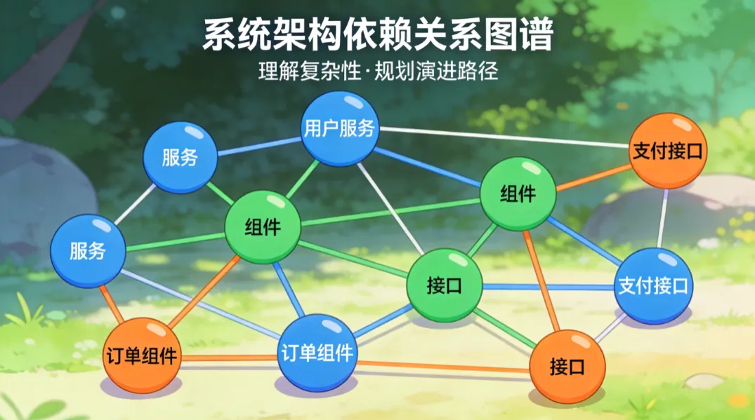 可视化图谱展示架构元素(服务、组件、接口)间的依赖关系,帮助团队理解系统复杂性和演进路径。