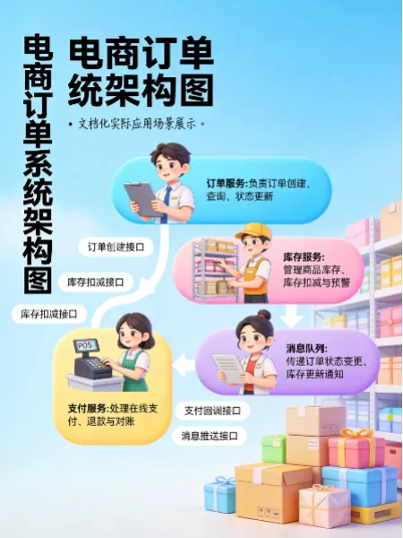 电商订单系统的架构图,标注了各个微服务的职责、API接口和消息队列,展示文档化的实际应用场景。