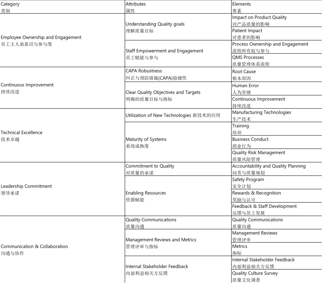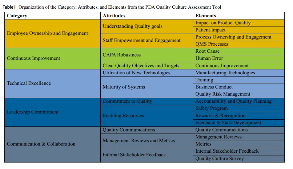 PDA QCAT工具包含20个要素(elements),每个要素代表特定的行为或操作实践。这些要素被组织成11个属性(attributes),进而汇总为5个 overarching 类别(categories),如下所示(亦见表I):1:员工主人翁意识与参与度(Employee Ownership and Engagement)、2:持续改进(Continuous Improvement)、3:技术卓越(Technical Excellence)、4:领导承诺(Leadership Commitment)、5:沟通与协作(Communication & Collaboration)。