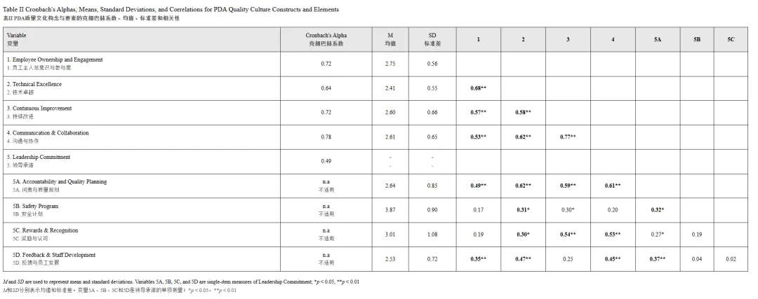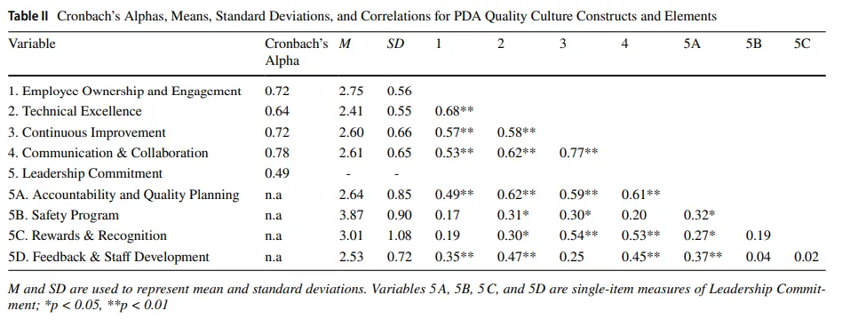 为检验PDA QCAT工具的结构连贯性,我们计算了四个可靠综合构念与领导承诺下各单项之间的皮尔逊相关性——即问责与质量规划(Accountability and Quality Planning)、安全计划、奖励与认可以及反馈与员工发展。四个综合构念显示出强且统计上显著的相互相关性(范围从r=0.53到r=0.77,所有p<0.01,见表II),表明质量文化各维度之间具有高度的内部结构和共享方差。相比之下,领导承诺的各单项与综合构念仅显示出适度且不一致的相关性。例如,问责与质量规划与所有四个综合构念显著相关(r=0.49至0.62),而安全计划、奖励与认可以及反馈与员工发展缺乏一致的对齐,与其他维度或领导承诺类别内其他要素的关联较弱或无显著相关性,如上所述。