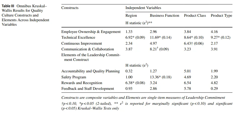 To examine whether quality culture perceptions varied across key organizational characteristics, we conducted a series of Kruskal–Wallis H tests for each of the four internally consistent composite constructs: Employee Ownership and Engagement, Technical Excellence, Continuous Improvement, and Communication & Collaboration. Independent variables included Geographic Region, Business Function, Product Class, and Product Type. Given the ordinal nature of the data and moderate sample sizes, nonparametric methods were used to avoid violations of ANOVA assumptions. Epsilon-squared (ε²) effect sizes were calculated for Kruskal–Wallis tests that yielded statistically significant or marginal p-values (p<0.10). Post hoc pairwise comparisons were conducted using Dunn’s test with Bonferroni correction where Kruskal–Wallis results were significant (p<0.05). A summary of test results is presented in Table III.