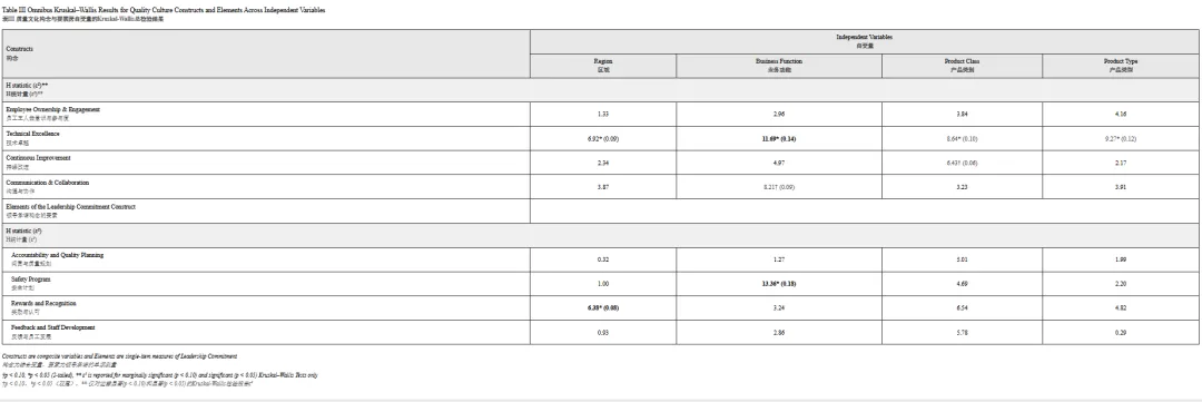 为进一步评估PDA QCAT工具,我们检验了领导承诺类别中四个要素的组间差异:问责与质量规划、安全计划、奖励与认可以及反馈与员工发展。鉴于该类别的内部一致性较低(克朗巴赫系数α=0.49),每个要素分别使用Kruskal-Wallis H检验按地理区域、业务功能、产品类别和产品类型进行分析,汇总于表III。