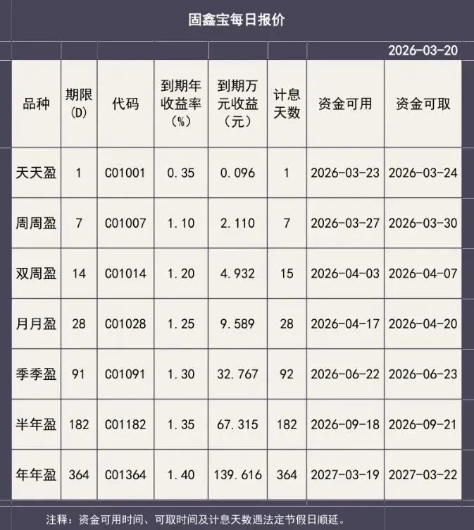 【固鑫宝】一款超灵活的理财工具(3月20日报价)