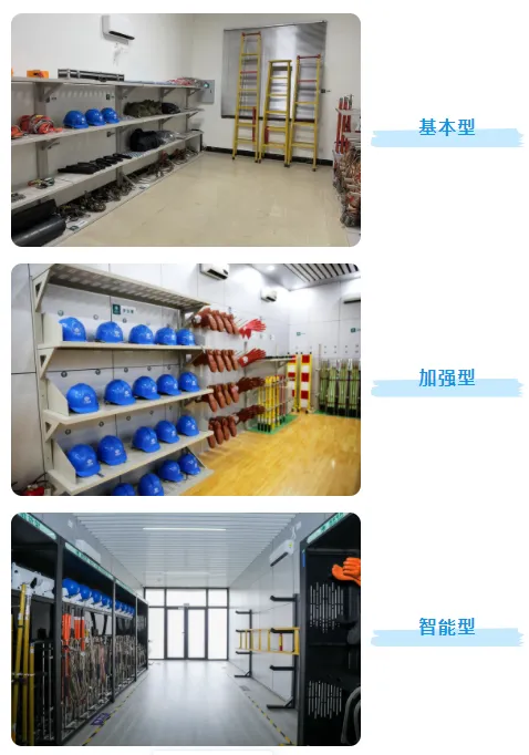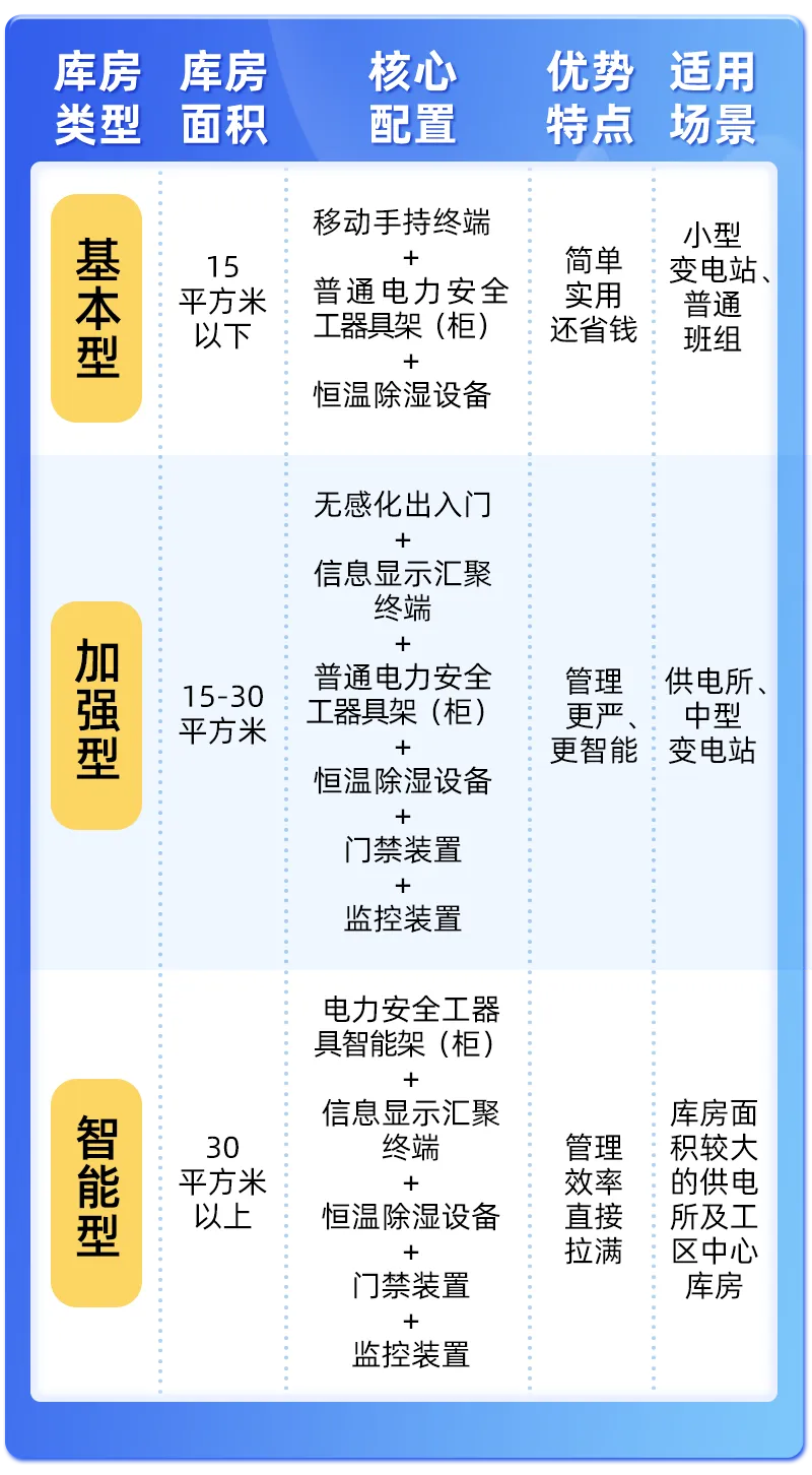 整体来说,电力安全工器具库房可分为基本型、加强型、智能型三类建设标准。大小库房各取所需,智能硬件自由搭配。