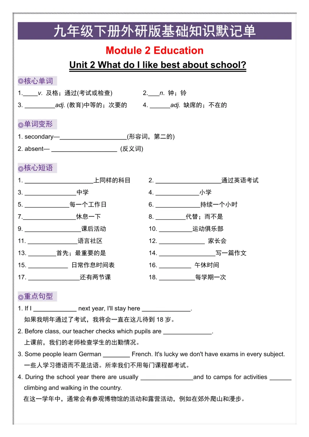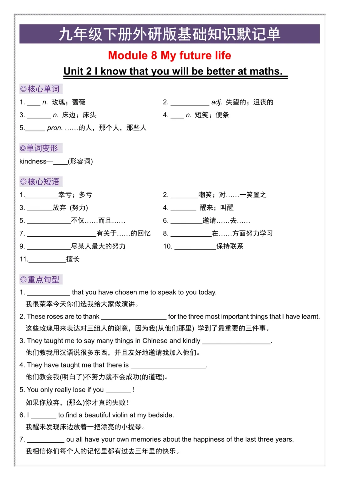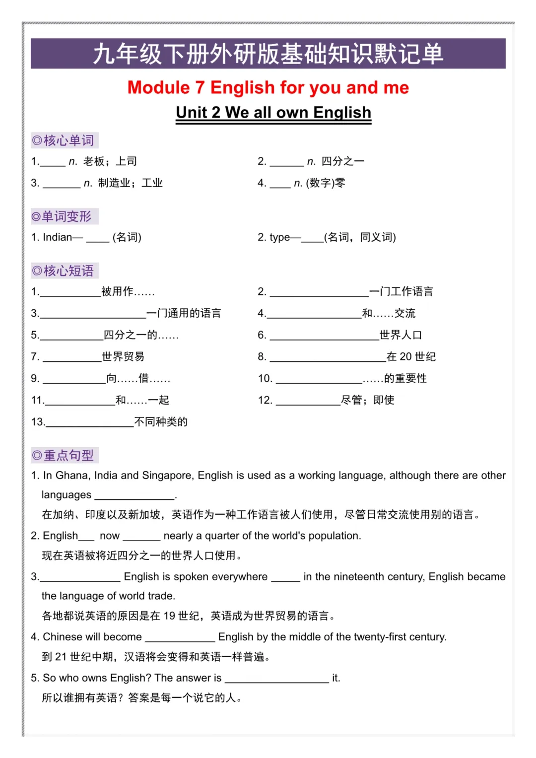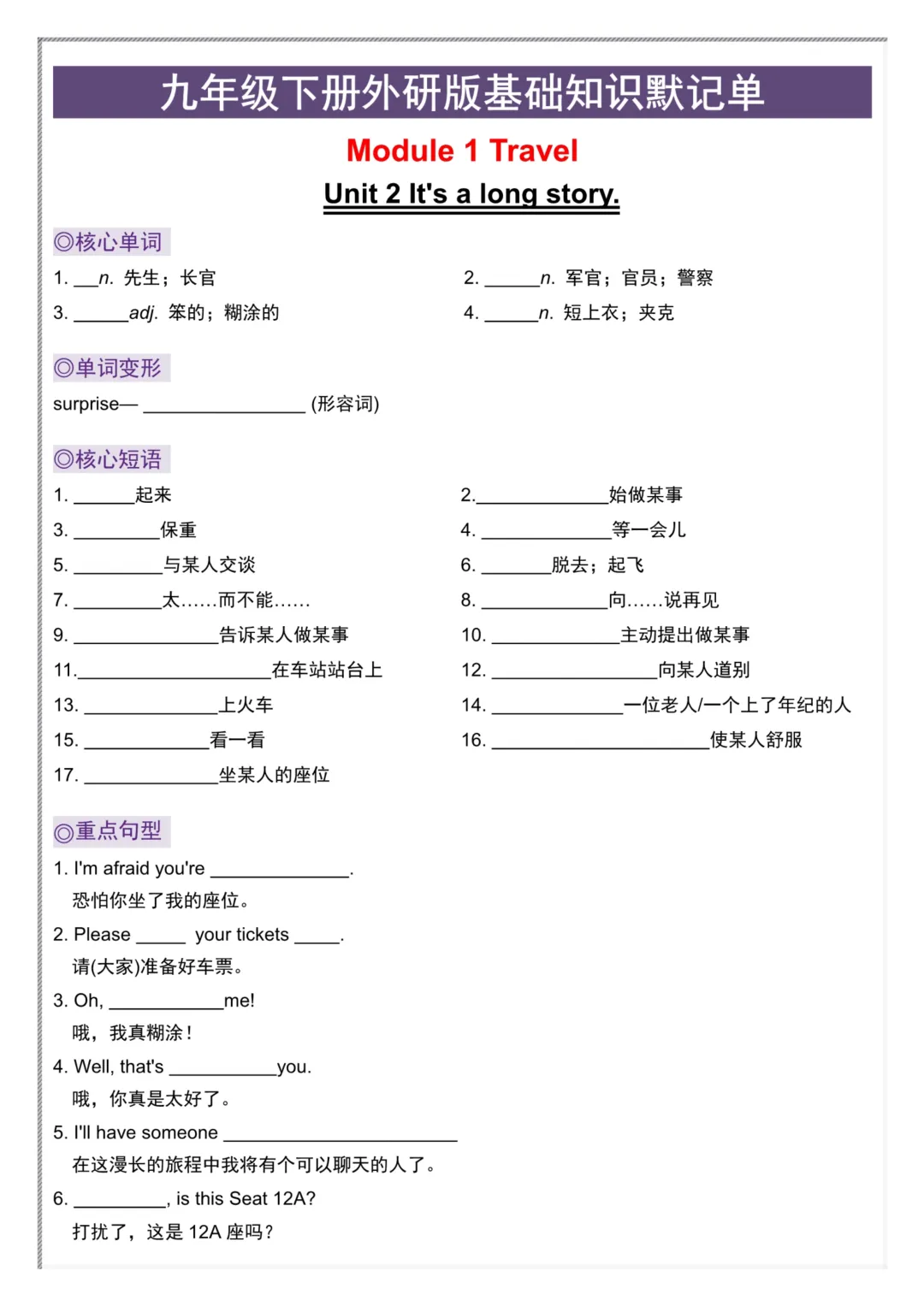 26年春九下外研基础知识默记单【空白+答案】,共32页含答案。便于自我检测答案提供了标准参照,学生可在默写后核对,快速发现拼写、语法或用词错误,及时纠正,提升学习效果。强化记忆效果通过对比答案,学生能更直观地理解单词、短语和句型的正确形式,加深印象,巩固记忆。培养独立学习能力学生无需依赖教师或家长讲解,可自主完成默写和核对,逐步养成独立思考和解决问题的习惯。提高学习效率答案帮助学生快速定位错误,避免重复犯错,节省学习时间,提升复习效率。增强学习信心当学生发现自己的默写与答案一致或接近时,会获得成就感,增强学习英语的自信心。需要的家长抓紧打印出来,让孩子写一写,练一练吧。