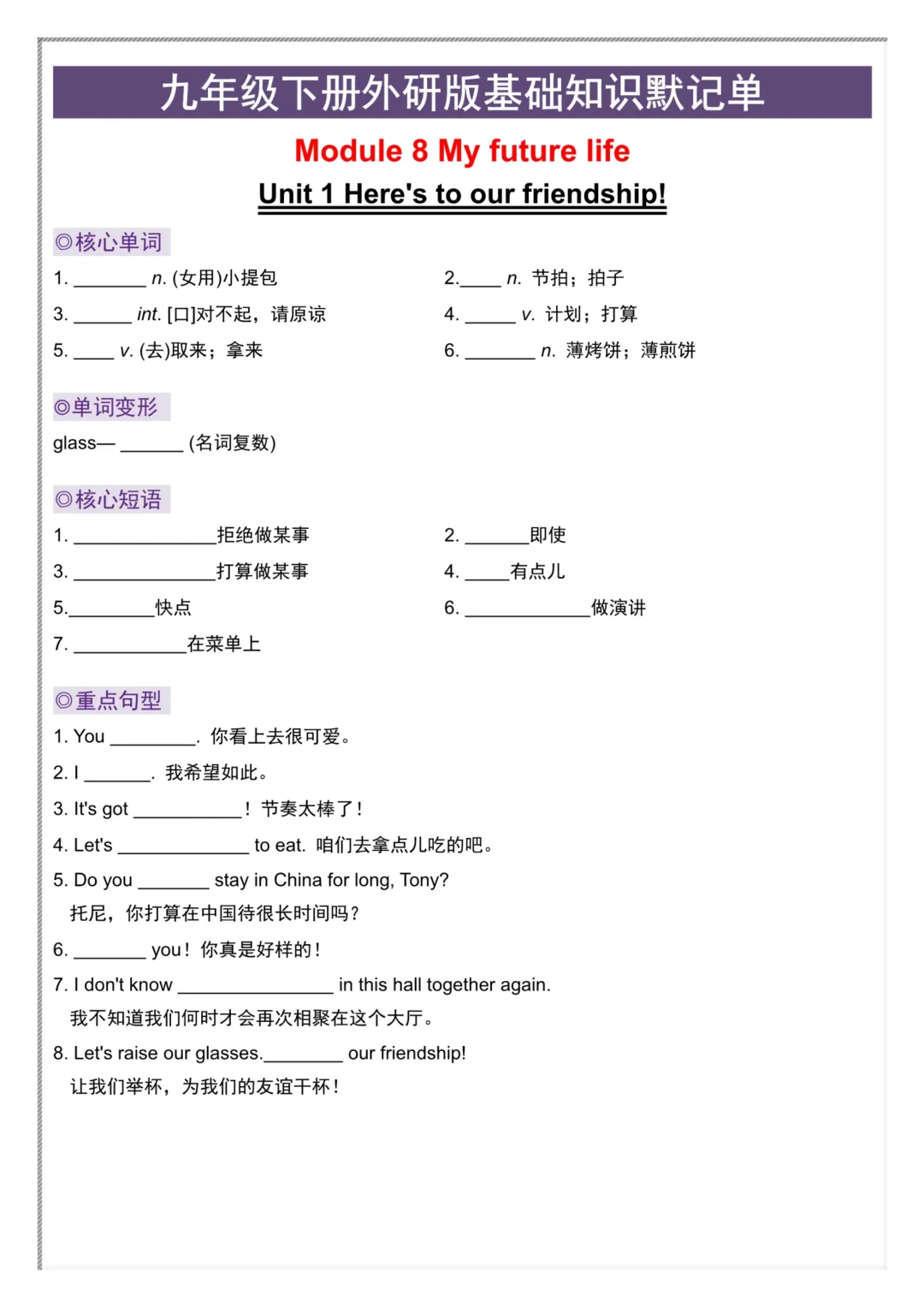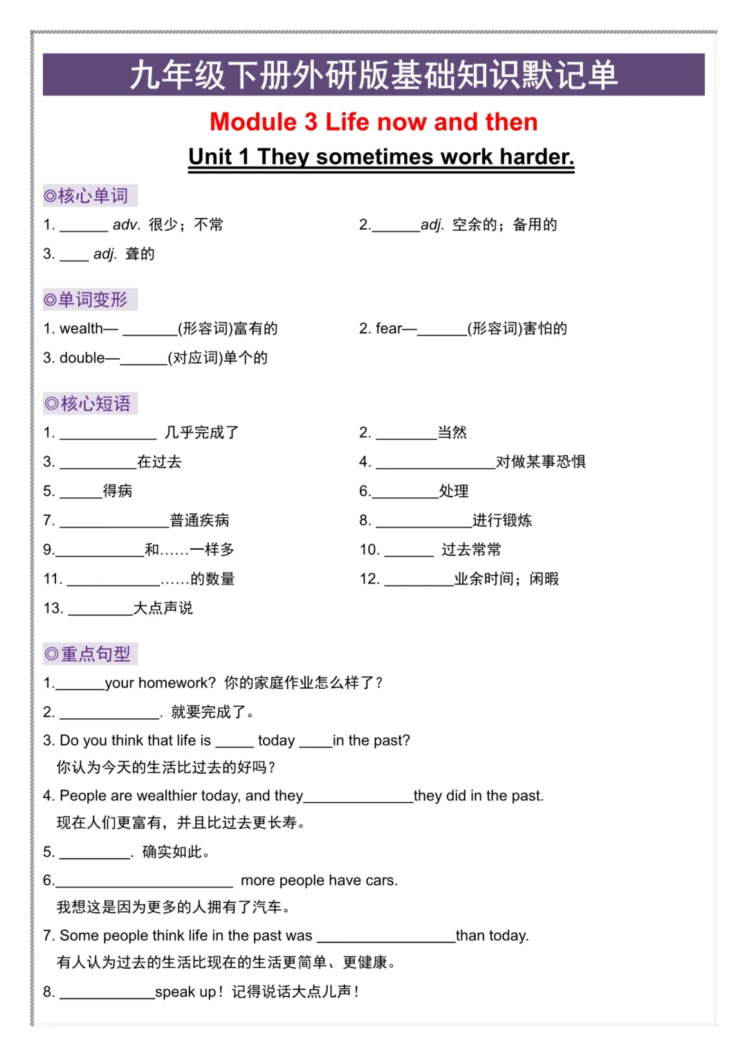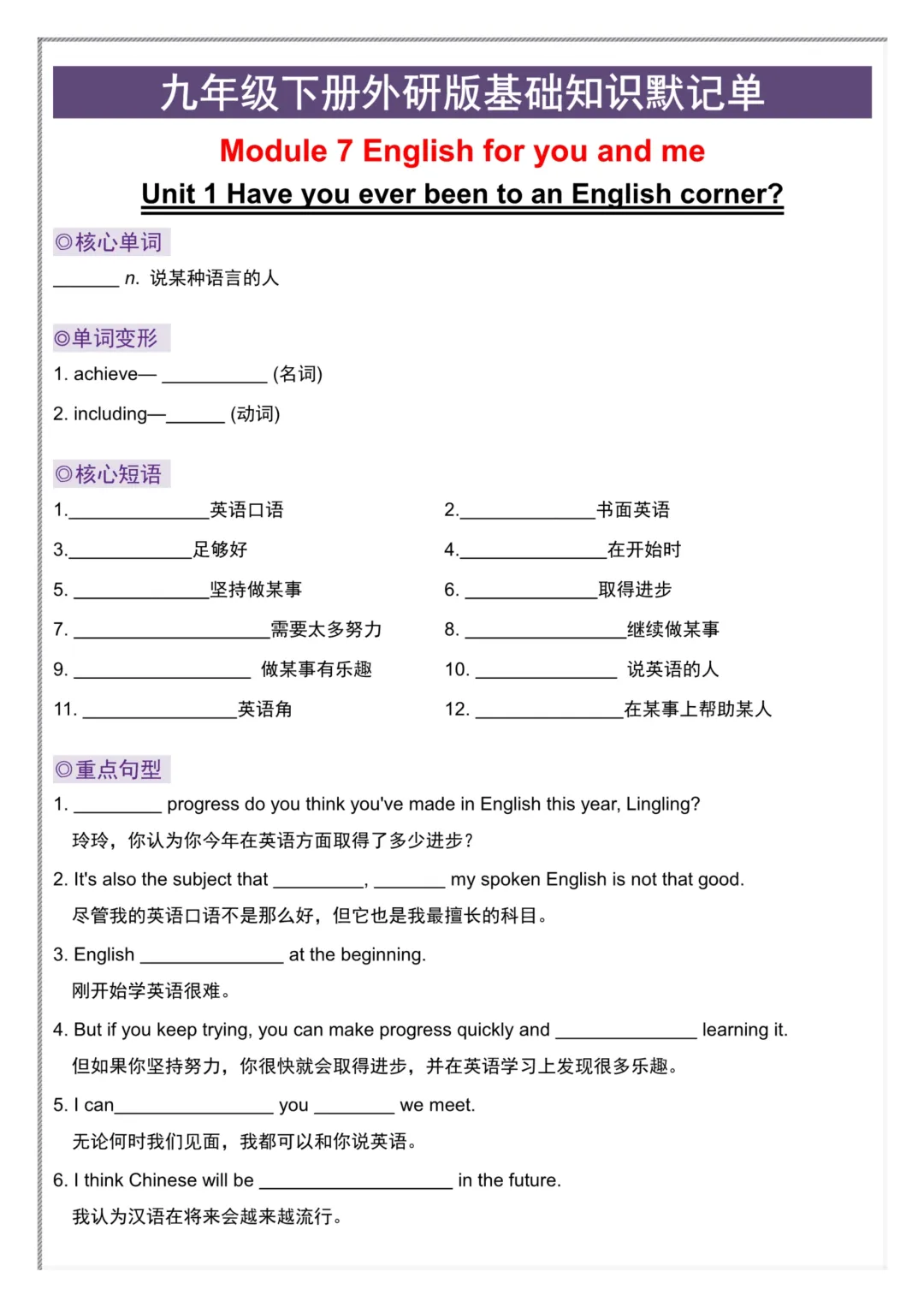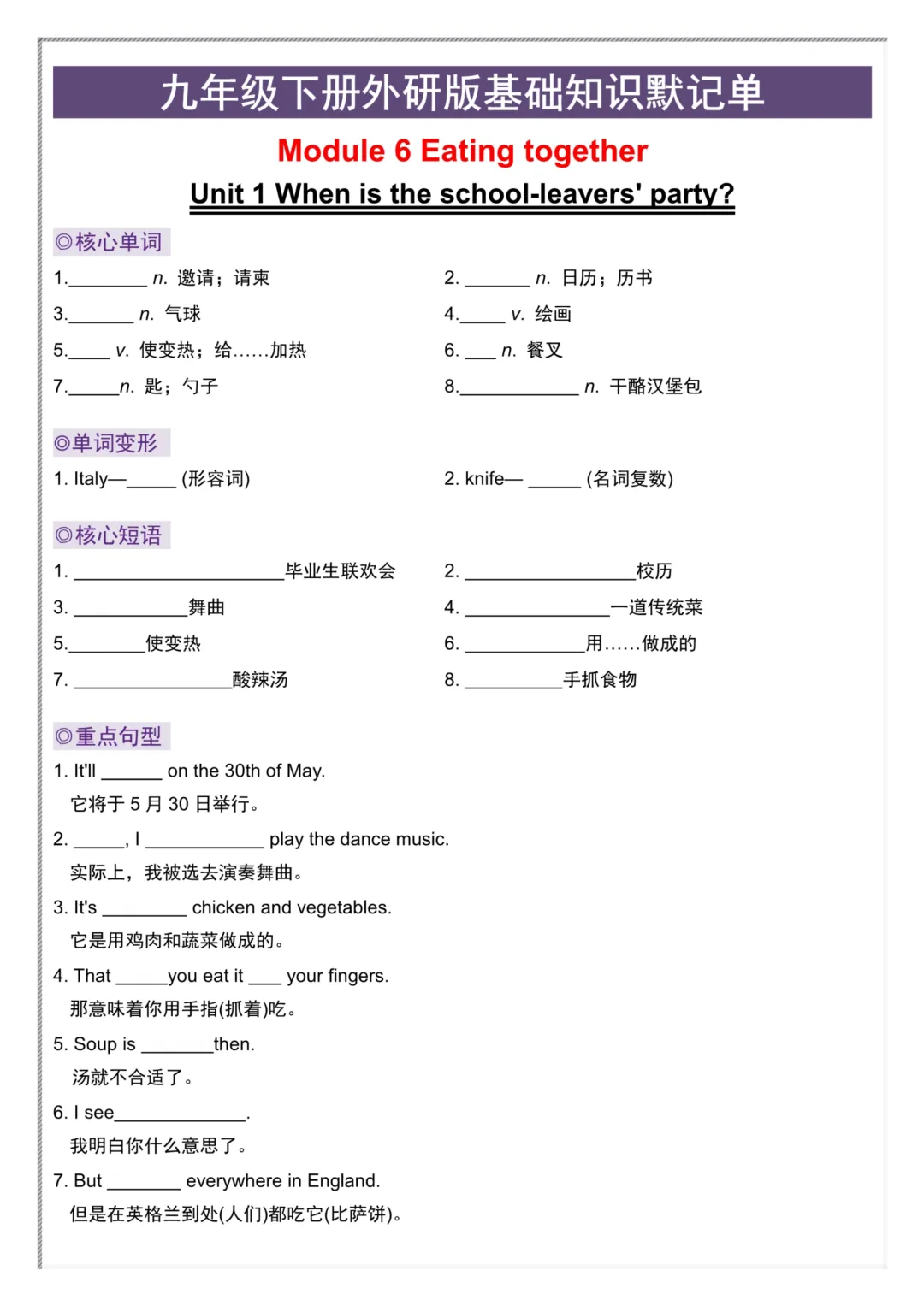 26年春九下外研基础知识默记单【空白+答案】,共32页含答案。便于自我检测答案提供了标准参照,学生可在默写后核对,快速发现拼写、语法或用词错误,及时纠正,提升学习效果。强化记忆效果通过对比答案,学生能更直观地理解单词、短语和句型的正确形式,加深印象,巩固记忆。培养独立学习能力学生无需依赖教师或家长讲解,可自主完成默写和核对,逐步养成独立思考和解决问题的习惯。提高学习效率答案帮助学生快速定位错误,避免重复犯错,节省学习时间,提升复习效率。增强学习信心当学生发现自己的默写与答案一致或接近时,会获得成就感,增强学习英语的自信心。需要的家长抓紧打印出来,让孩子写一写,练一练吧。