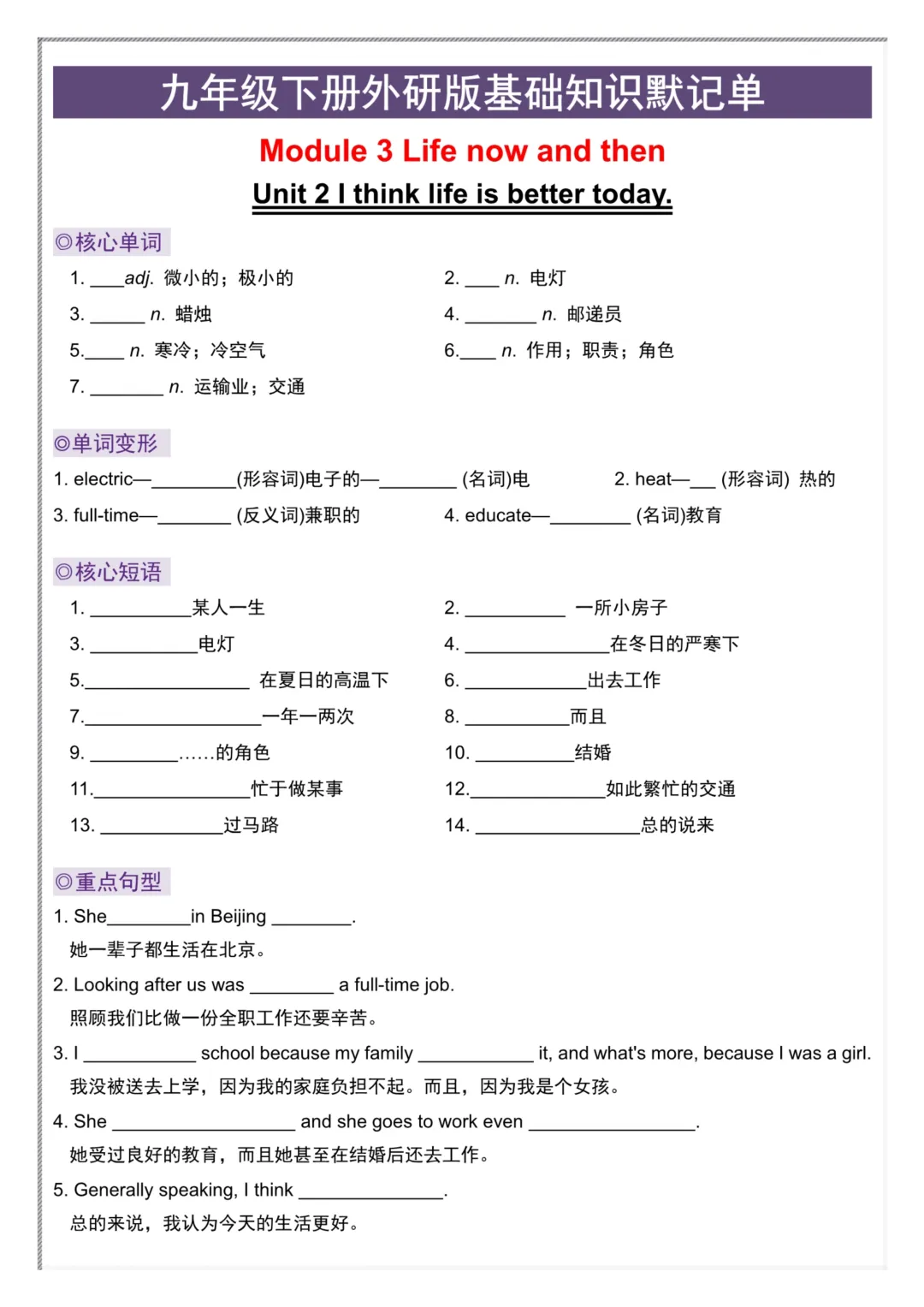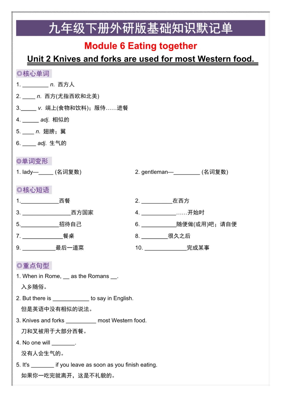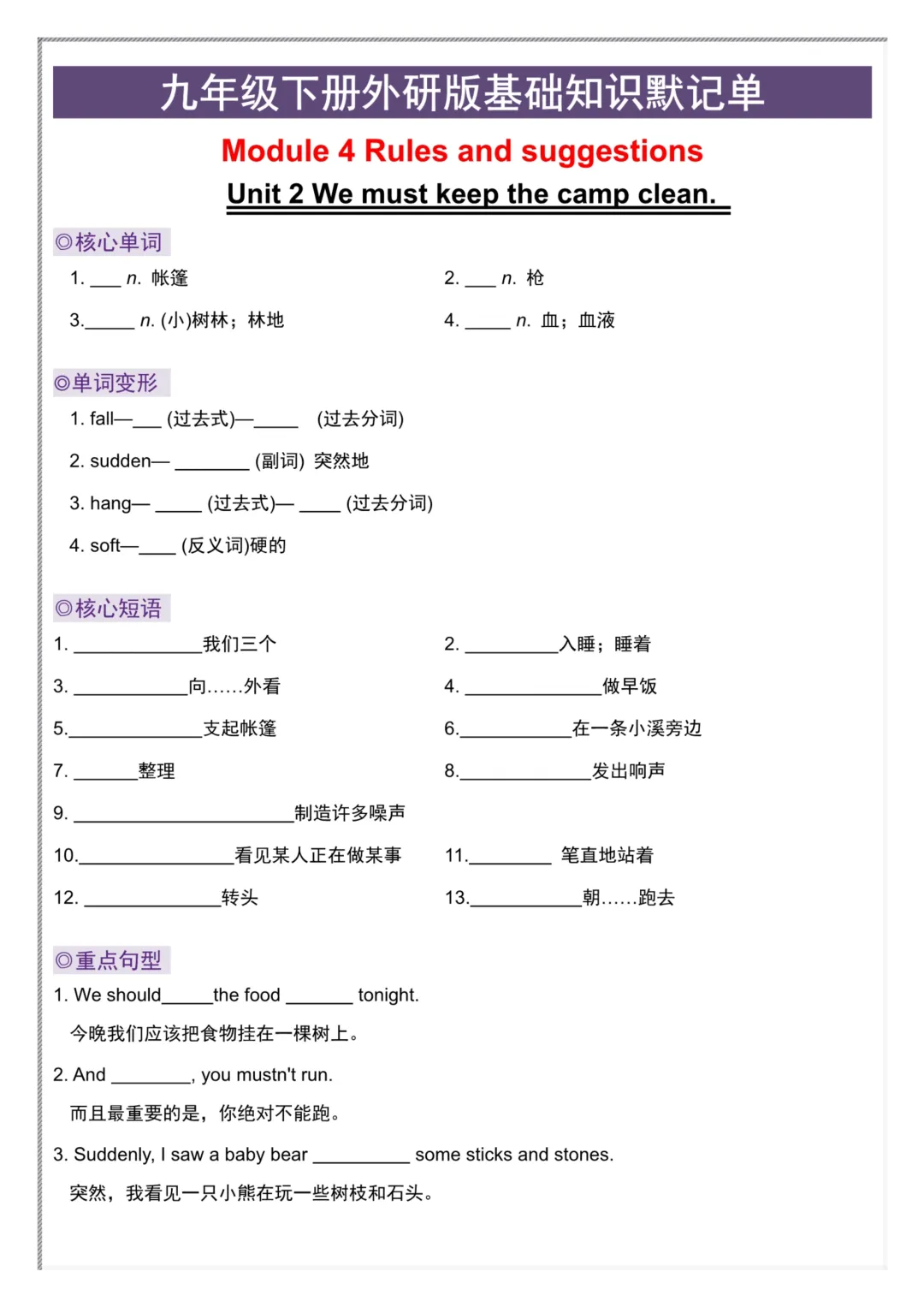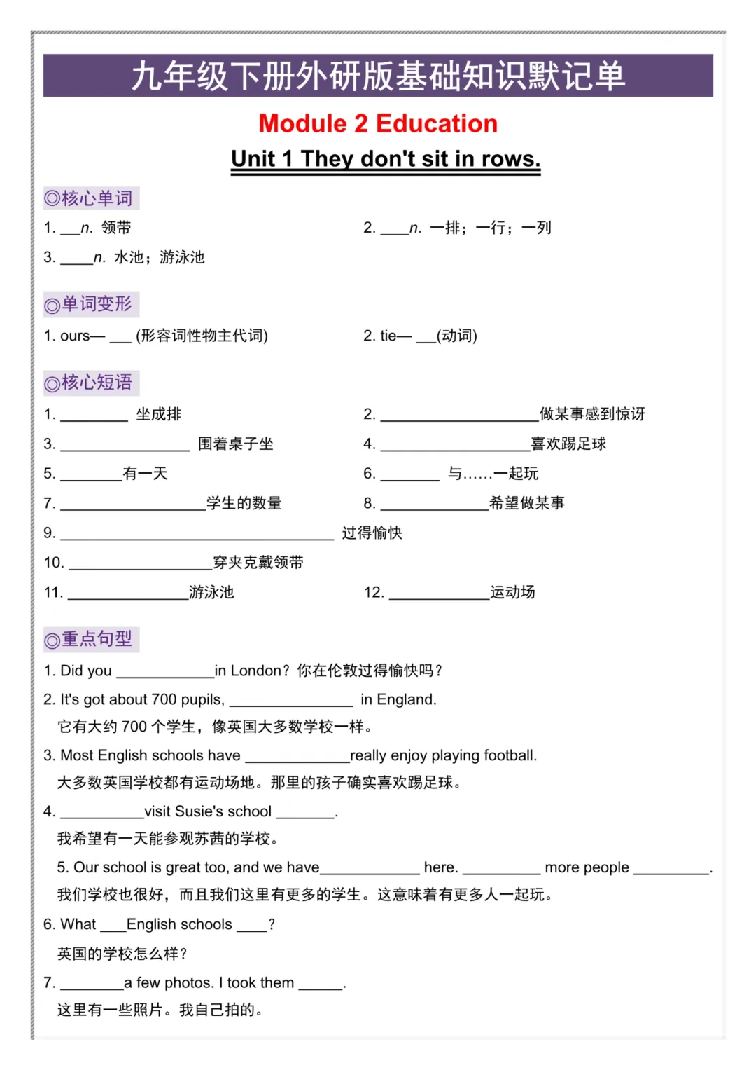 26年春九下外研基础知识默记单【空白+答案】,共32页含答案。便于自我检测答案提供了标准参照,学生可在默写后核对,快速发现拼写、语法或用词错误,及时纠正,提升学习效果。强化记忆效果通过对比答案,学生能更直观地理解单词、短语和句型的正确形式,加深印象,巩固记忆。培养独立学习能力学生无需依赖教师或家长讲解,可自主完成默写和核对,逐步养成独立思考和解决问题的习惯。提高学习效率答案帮助学生快速定位错误,避免重复犯错,节省学习时间,提升复习效率。增强学习信心当学生发现自己的默写与答案一致或接近时,会获得成就感,增强学习英语的自信心。需要的家长抓紧打印出来,让孩子写一写,练一练吧。
