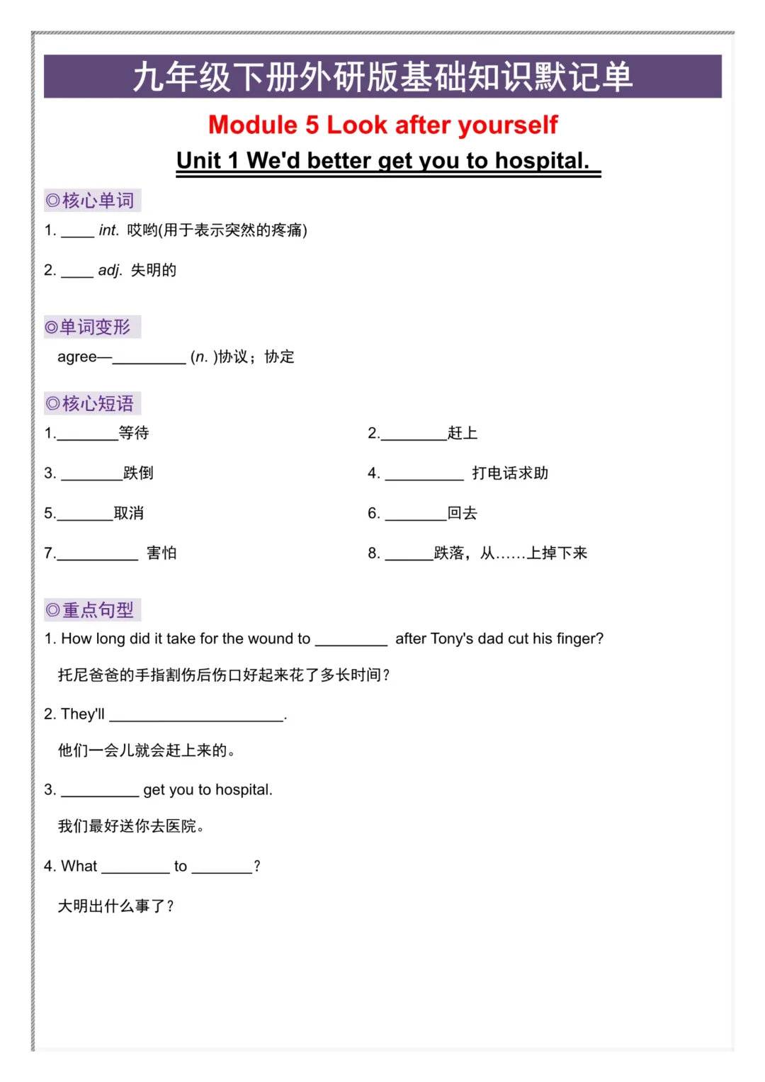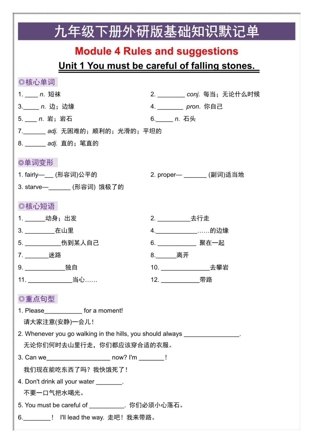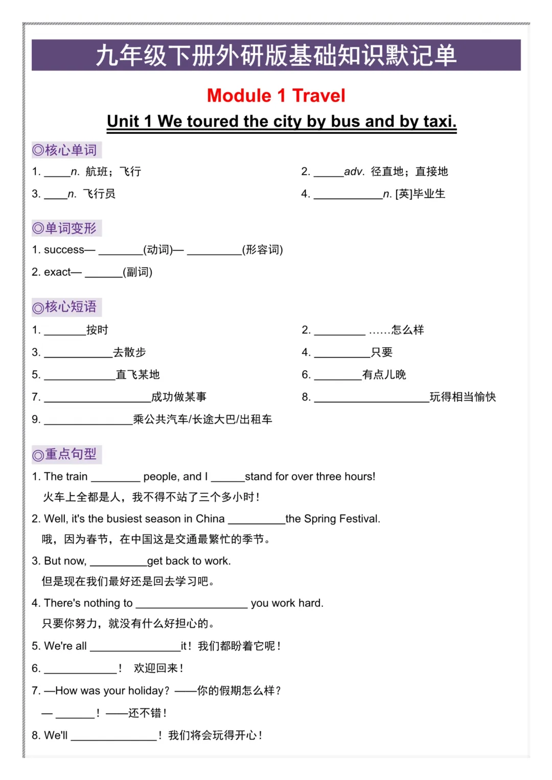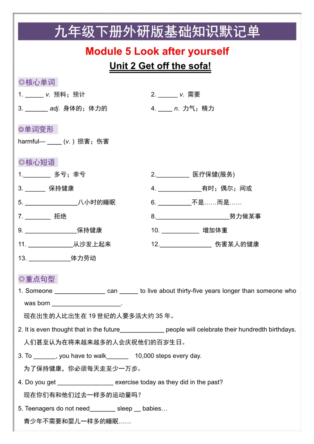 26年春九下外研基础知识默记单【空白+答案】,共32页含答案。便于自我检测答案提供了标准参照,学生可在默写后核对,快速发现拼写、语法或用词错误,及时纠正,提升学习效果。强化记忆效果通过对比答案,学生能更直观地理解单词、短语和句型的正确形式,加深印象,巩固记忆。培养独立学习能力学生无需依赖教师或家长讲解,可自主完成默写和核对,逐步养成独立思考和解决问题的习惯。提高学习效率答案帮助学生快速定位错误,避免重复犯错,节省学习时间,提升复习效率。增强学习信心当学生发现自己的默写与答案一致或接近时,会获得成就感,增强学习英语的自信心。需要的家长抓紧打印出来,让孩子写一写,练一练吧。