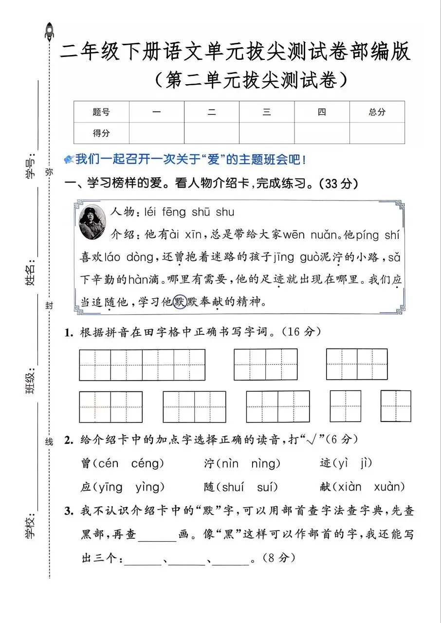 【单元卷】二年级语文第二单元拔尖测试卷,电子版可下载打印!