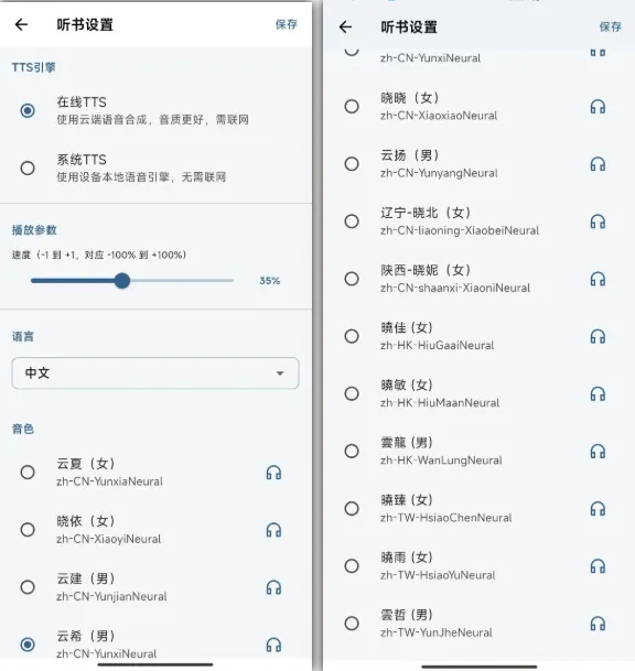听书设置里,我们有在线的TTS,调用的应该是微软的接口,比较受大家欢迎的有晓晓、云扬、云夏等等。