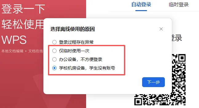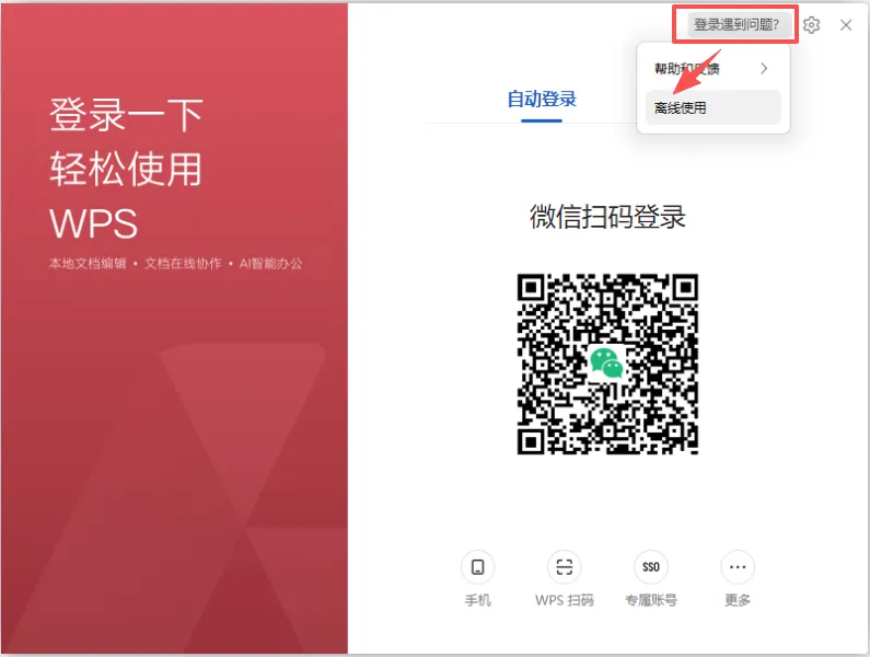 1. 打开 WPS,在登录界面的右上角,找到「登录遇到问题」,点击展开下拉菜单,然后选择「离线使用」