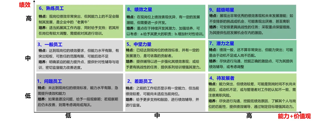 人才盘点是什么意思,就是通过能力、绩效两个维度,每个维度设置高中低三个等级,这样就把人放进对应的九宫格里面(如下图)