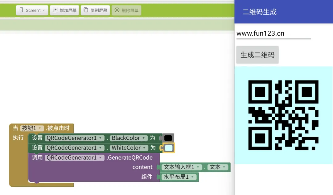 AppInventor2 QRCodeGenerator 拓展,用于生成二维码。 简单易用的二维码生成器拓展,可定制二维码颜色、背景色。