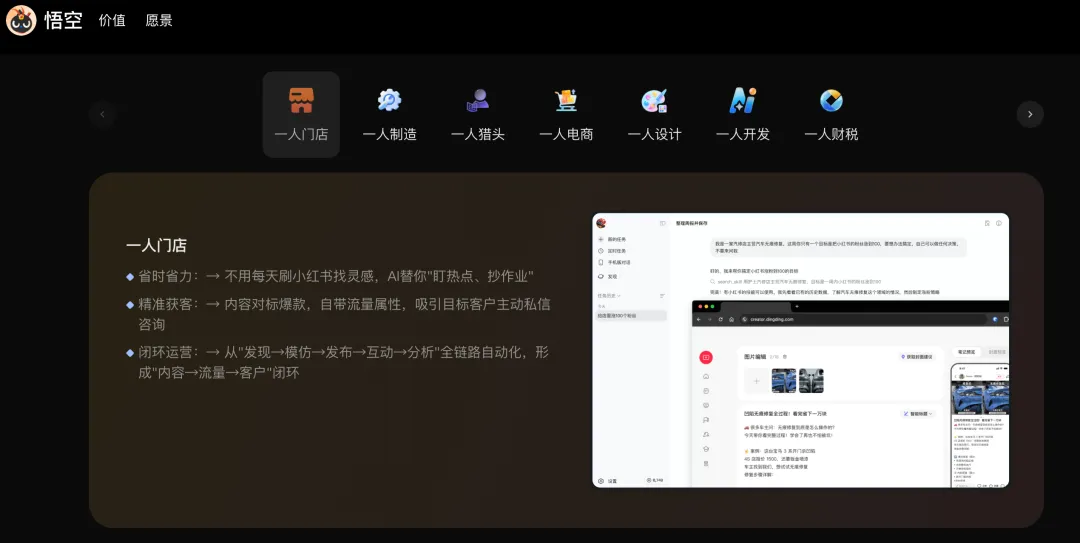 一人门店:不用每天刷小红书找灵感,AI替你”盯热点、抄作业”;内容对标爆款,自带流量属性;从”发现→模仿→发布→互动→分析”全链路自动化