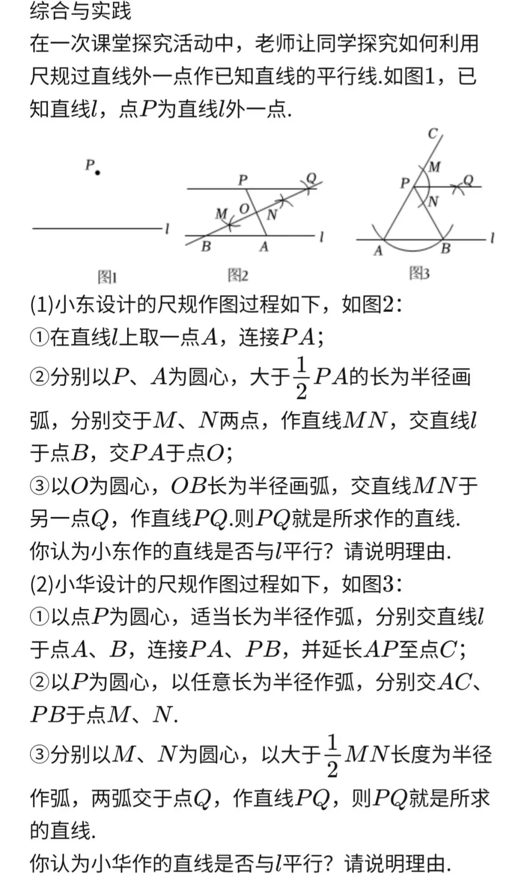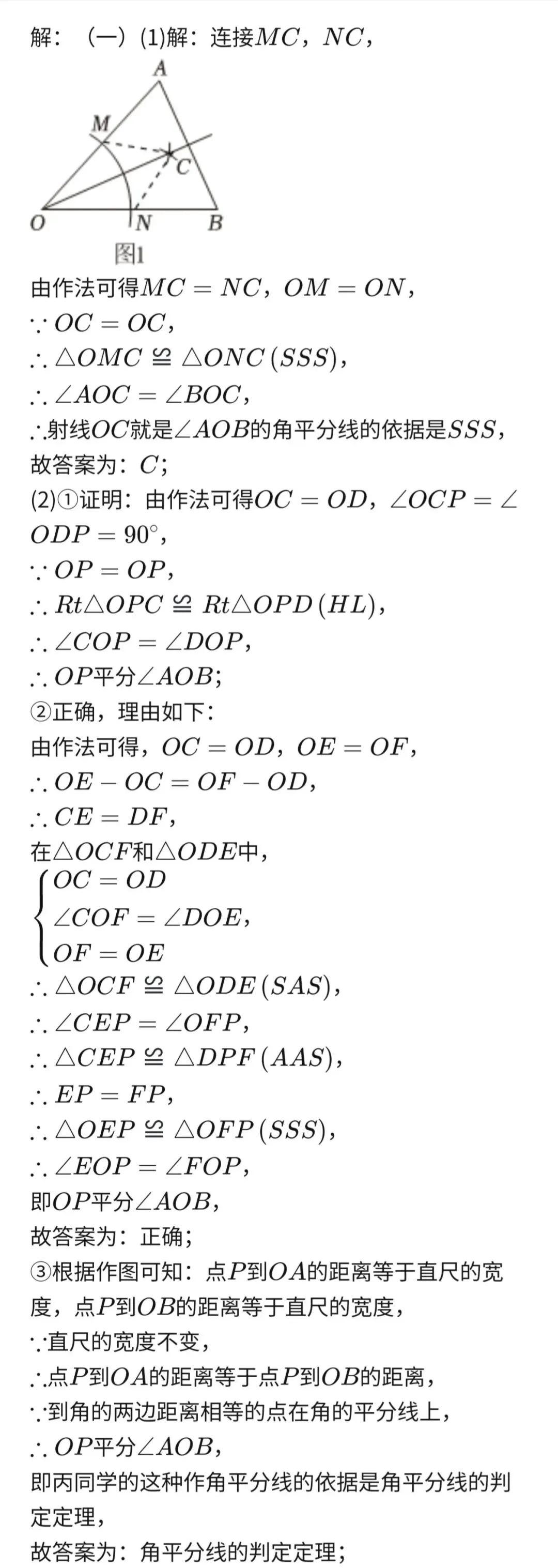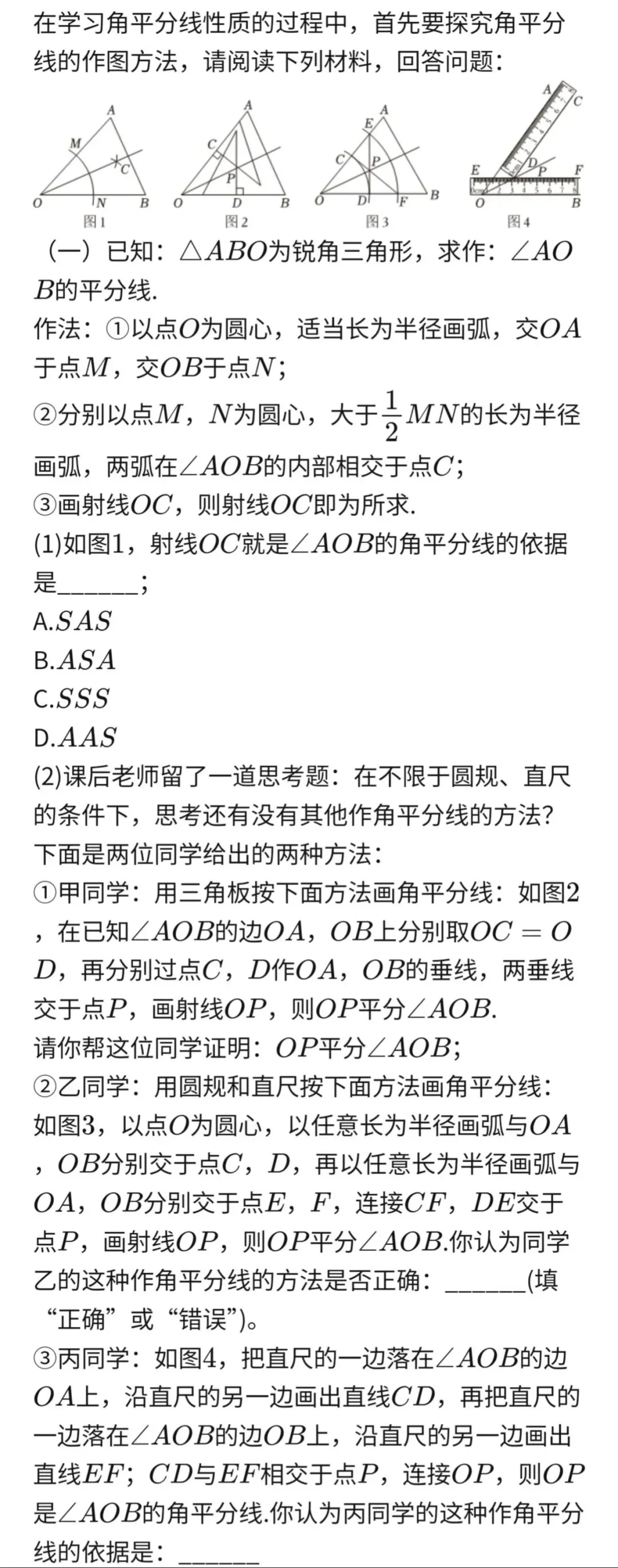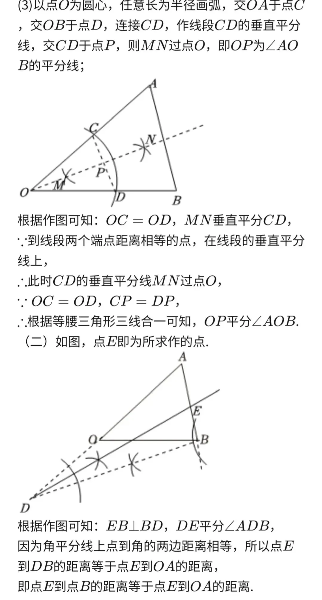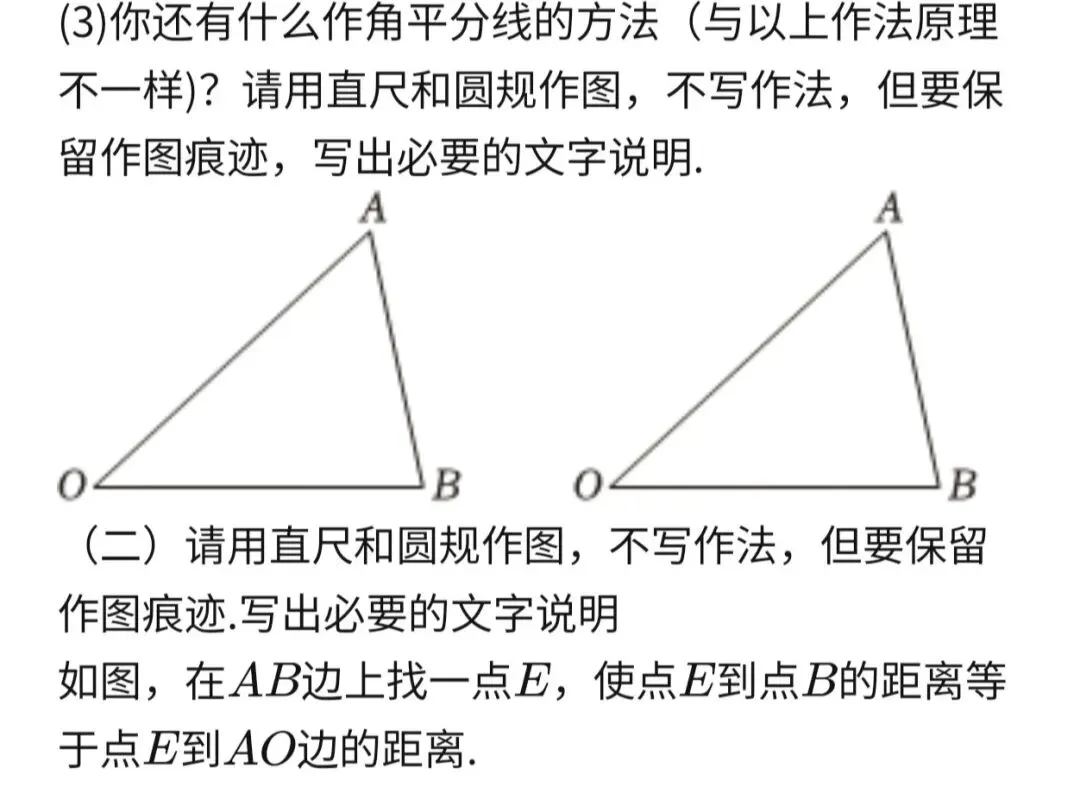 今天分享这道“角平分线的多种作图方法”题——它的核心是围绕“角平分线的定义、判定定理”,用不同几何原理实现角平分线的作图,从基础尺规作图到创新方法,覆盖了角平分线的核心性质: