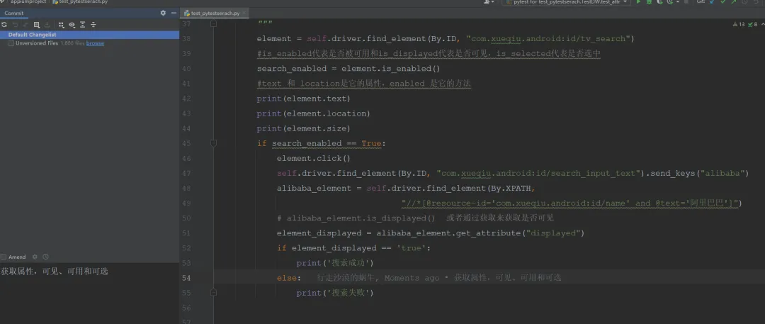 from appium import webdriverimport time# 配置Desired Capabilitydesired_caps = {"platformName": "Android","deviceName": "127.0.0.1:7555","appPackage": "com.xueqiu.android","appActivity": ".view.WelcomeActivityAlias","noReset": True,"unicodeKeyboard": True, # 支持中文输入"resetKeyboard": True}# 连接Appium Serverdriver = webdriver.Remote("http://127.0.0.1:4723/wd/hub", desired_caps)driver.implicitly_wait(30) # 隐式等待# 1. 定位搜索框并操作search_el = driver.find_element_by_id("com.xueqiu.android:id/tv_search")# 检查搜索框是否可见、可用print("搜索框是否可见:", search_el.is_displayed()) # 输出Trueprint("搜索框是否可用:", search_el.is_enabled()) # 输出True# 点击搜索框search_el.click()# 2. 定位输入框,输入内容input_el = driver.find_element_by_id("com.xueqiu.android:id/search_input_text")input_el.clear() # 清空原有内容input_el.send_keys("Appium") # 输入文本# 验证输入内容(通过get_attribute获取value)print("输入框内容:", input_el.get_attribute("text")) # 输出:Appium# 3. 获取输入框的坐标和尺寸print("输入框坐标:", input_el.location) # 输出如{'x': 100, 'y': 200}print("输入框尺寸:", input_el.size) # 输出如{'width': 600, 'height': 80}# 4. 定位“搜索”按钮,检查是否可点击search_btn = driver.find_element_by_xpath("//*[@text='搜索']")if search_btn.is_enabled():search_btn.click()print("点击搜索按钮成功")time.sleep(3)driver.quit() # 关闭APP