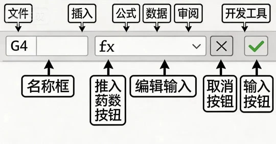 2. 编辑栏(菜单栏下方):输入内容时,这里会同步显示,改公式、长文本时在这输更方便;