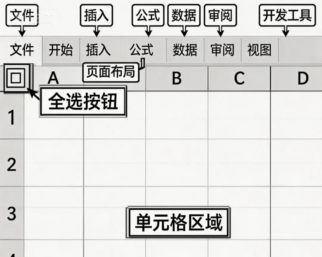 3. 工作表区(中间大表格):就是你填数据的格子区,左边是行号(1、2、3…),上边是列标(A、B、C…),格子叫“单元格”(比如A1是第1列第1行);