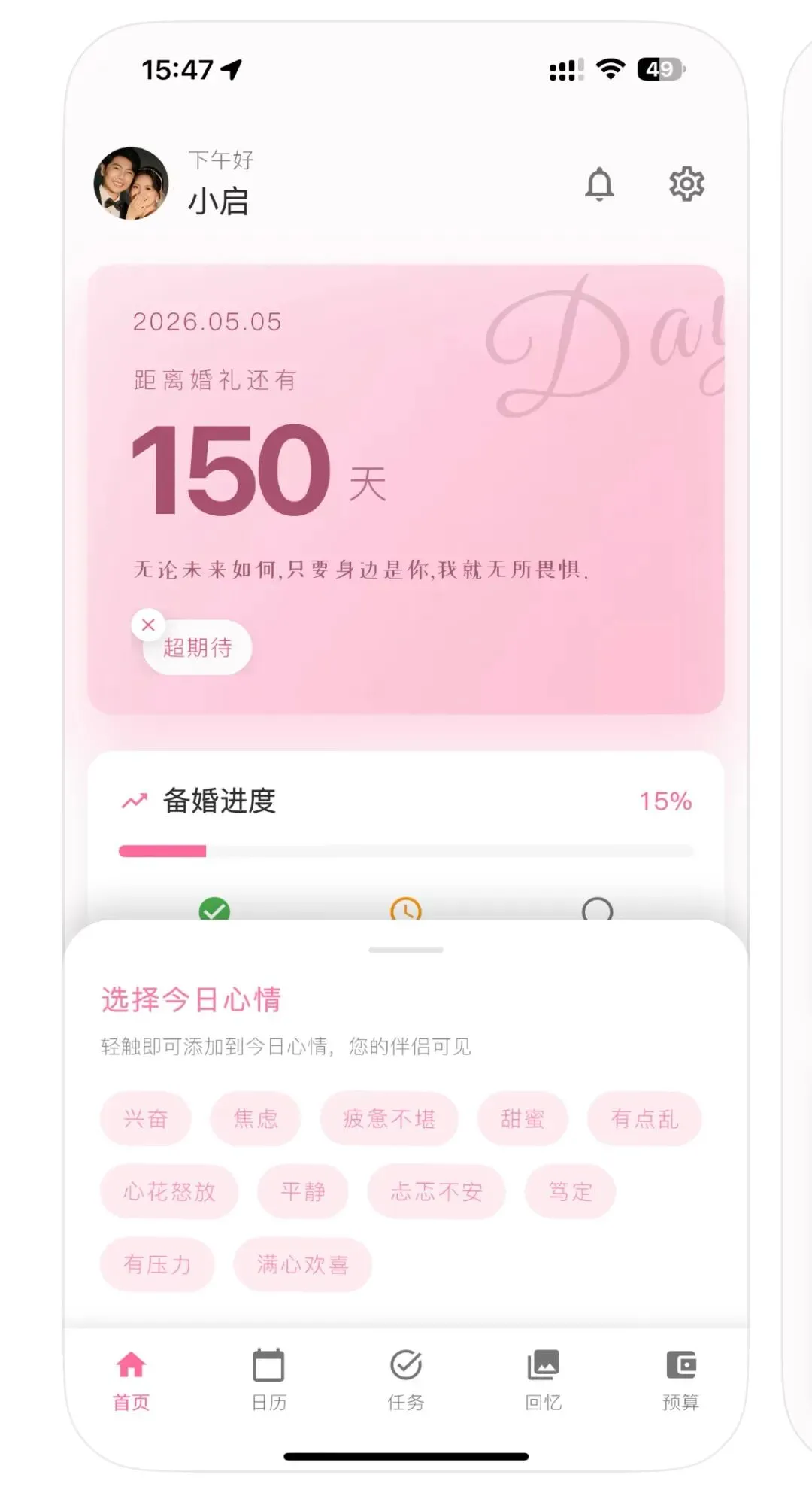 和市面上不少备婚工具不同,《婚启》不只是一个冰冷的筹备工具,更注重新人备婚过程中的心情体验,这也是夫妻俩的产品设计理念。郭女士提出的“心情胶囊”功能,成了APP的一大特色,备婚的情侣可以在APP主页每日选择自己的心情,这份心情还能共享给伴侣,系统会根据所选的心情推送暖心的鼓励语录,焦虑时会收到“慢一点也没关系”的安慰,甜蜜时也会有对应的美好寄语。