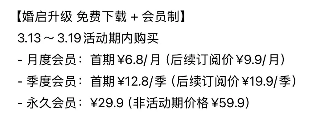 《婚启》的定价也很亲民,多级订阅制,夫妻二人就能共同使用,这个定价也收获了用户的认可。在APP突然走红后,有用户在群里留言,觉得定价很良心,还担心夫妻俩能否长期运营,因为自己还在备婚初期,后续还需要用到这个工具。
