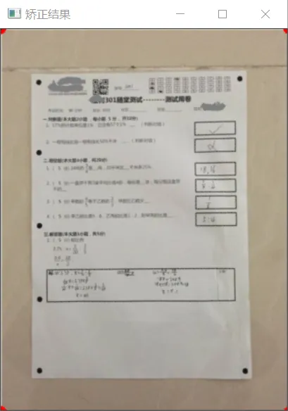 // 透视变换Mat M = getPerspectiveTransform(srcpoint, dstpoint);Mat result = Mat::zeros(Size(width, height), CV_8UC3);warpPerspective(src, result, M, result.size());imshow("矫正结果", result);