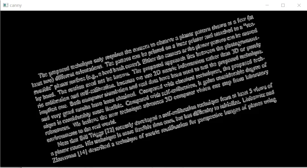 Mat src, src_edge, src_gray,src_rotate;double angle;src = imread("D:/opencv练习图片/文本矫正.png");imshow("文本图片", src);cvtColor(src, src_gray, COLOR_RGB2GRAY);Canny(src_gray, src_edge, 50, 200, 3);imshow("canny", src_edge);