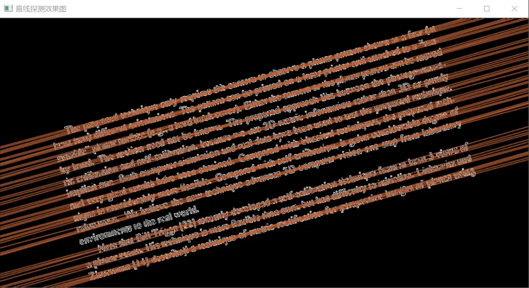 //通过霍夫变换检测直线vector<Vec2f> plines;//第5个参数就是阈值,阈值越大,检测精度越高HoughLines(src_edge, plines, 1, CV_PI / 180, 200, 0, 0);cout << plines.size() << endl;//由于图像不同,阈值不好设定,因为阈值设定过高导致无法检测直线,阈值过低直线太多,速度很慢//所以根据阈值由大到小设置了三个阈值,如果经过大量试验后,可以固定一个适合的阈值。float sum = 0;//依次画出每条线段for (size_t i = 0; i < plines.size(); i++){float rho = plines[i][0];float theta = plines[i][1];Point pt1, pt2;double a = cos(theta), b = sin(theta);double x0 = a * rho, y0 = b * rho;pt1.x = cvRound(x0 + 1000 * (-b));//cvRound四舍五入pt1.y = cvRound(y0 + 1000 * (a));pt2.x = cvRound(x0 - 1000 * (-b));pt2.y = cvRound(y0 - 1000 * (a));sum += theta;line(src_gray, pt1, pt2, Scalar(55, 100, 195), 1, LINE_AA);//Scalar函数用于调节线段颜色imshow("直线探测效果图", src_gray);float average = sum / plines.size(); //对所有角度求平均,这样做旋转效果会更好angle = DegreeTrans(average) - 90;}