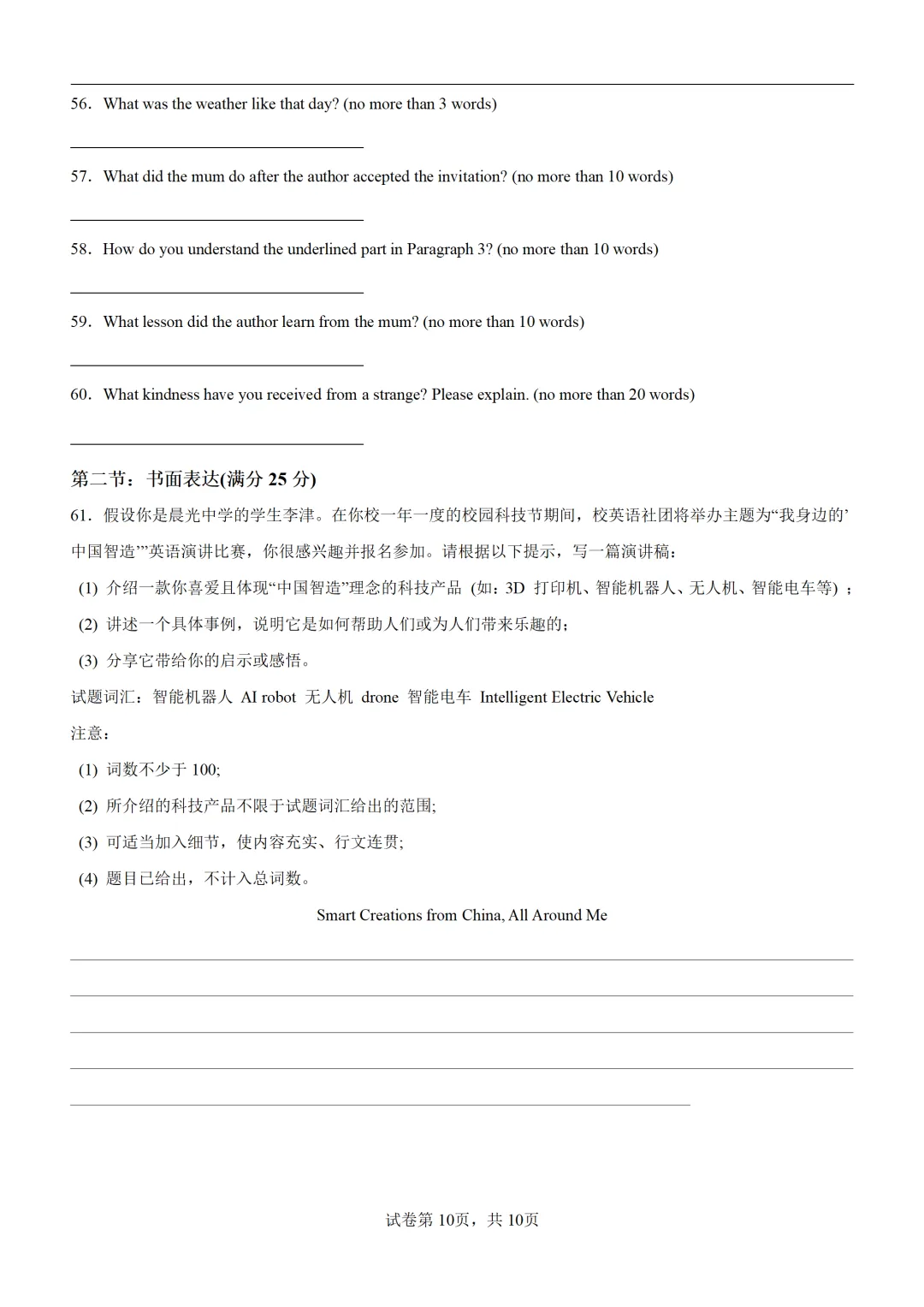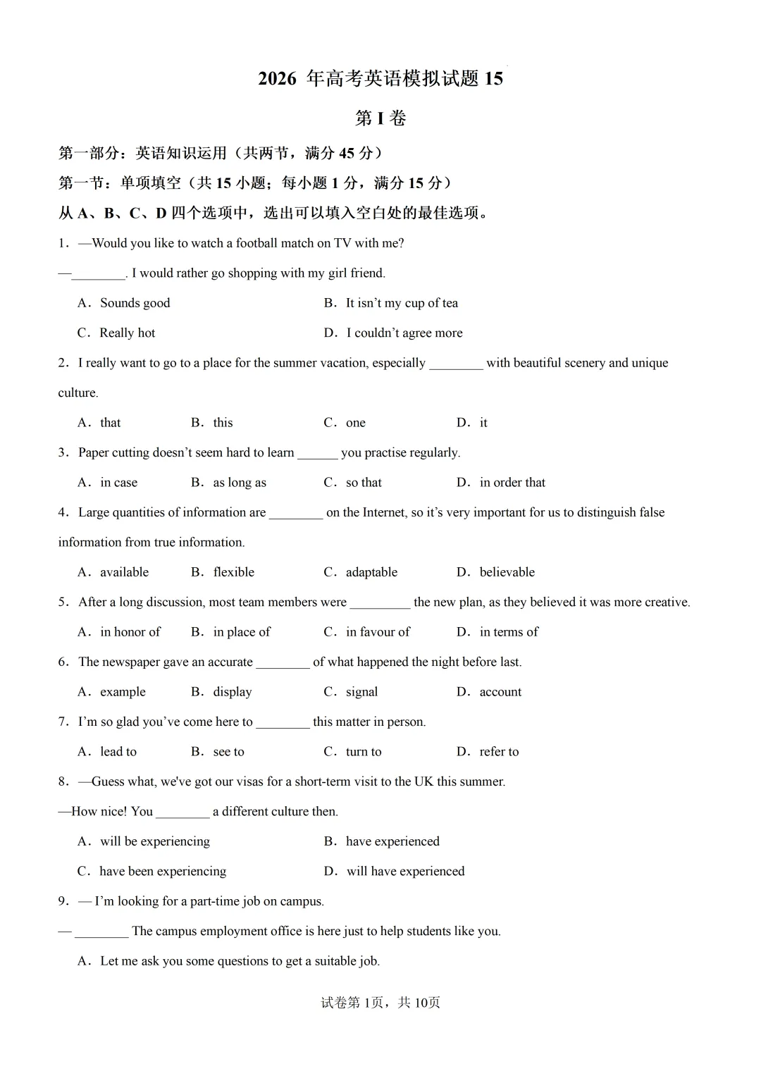【可打印】2026 年高考英语模拟试题15(天津专用)(附解析) 点击上方“蓝字”免费关注! 本套试卷+答案解析下载入口 关注“卿卿侃古今”公众号 点击左下角阅读原文可下载 相关链接: 2007-2025年天津市高考英语真题汇总(持续更新中~) 2011-2023年天津高考英语听力真题在线测试 【高考英语听力在线测试】高考听力机考模拟试题大全(持续更新中) 【可下载】2025-2026年高中英语试题汇总(附解析)【持续更新中】 【汇总】高中英语月考和期中期末试题(持续更新中~) 【题库】高一英语试题汇编(持续更新中~) 【题库】高二英语试题汇编(持续更新中~) 【题库】高三英语试题汇编(持续更新中~) 【可下载】高三英语上学期期末试题16套(附解析) 【可下载】高二英语上学期期末试题10套(附解析) 【可下载】高一英语上学期期末试题汇9套(附解析) 【可下载】2025-2026学年度高一高二高三开学考试模拟试卷(天津专用)(附解析) 新外研版高中英语高清电子课本、课文原文和译文、单元同步复习资料和试题【持续更新中】 【目录1】高中英语阅读理解限时训练大全(持续更新中~) 【目录2】高中英语完形填空限时训练大全(持续更新中~) 【目录3】高中英语书面表达大全(持续更新中~) 【目录4】高中英语听力训练大全(持续更新中~) 【目录5】高中英语单选题大全(持续更新中~) 【目录6】高中英语语法题大全(持续更新中~) 【目录7】高中英语阅读表达题大全(持续更新中~) 【目录8】科普知识汇总 【目录9】中高考学法知识汇总 【目录10】高考英语真题+名校模拟真题+月考和期中期末试题(持续更新中~) 【目录11】暑期高考英语备考资料大全持续更新中~【汇总】中高考志愿填报资料大全 【汇总】高中英语月考和期中期末试题(持续更新中~) 【汇总】2025届高三英语一模试题(附解析) 【汇总】2024届高三英语一模二模三模试题(附解析) 【汇总】2024届高考英语押题卷(附解析) 【汇总】2025届高三英语周考综合练(附解析) 【题库】高三英语限时训练(持续更新中~) 【模拟】2025届高三英语听力机考模拟试题在线测试 【高考词汇】(新)外研版高中英语全七册词汇表(附音频) 【中考词汇】初中英语外研版必备单词表(完整版),可打印 建议收藏保存 点击阅读原文查更多