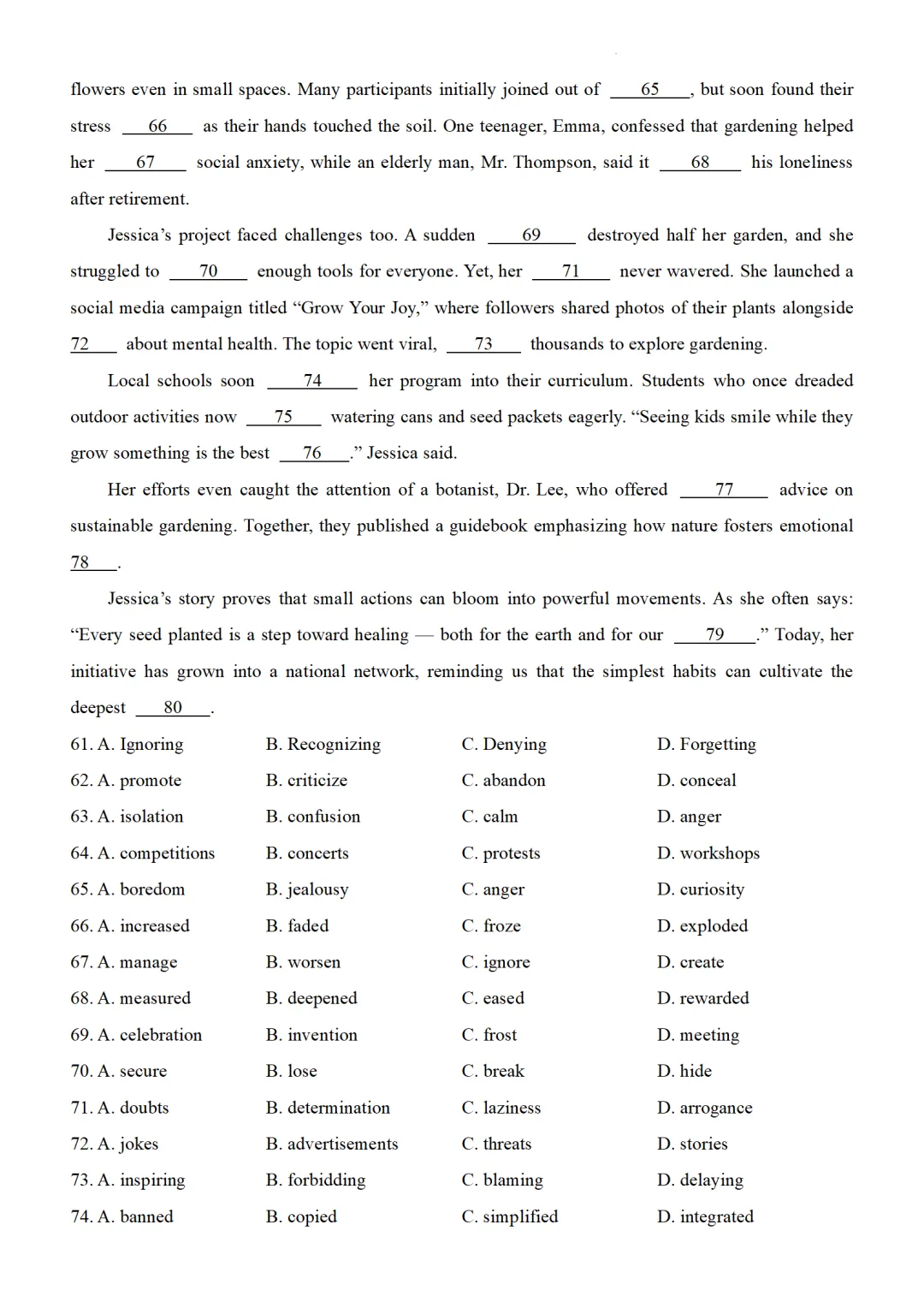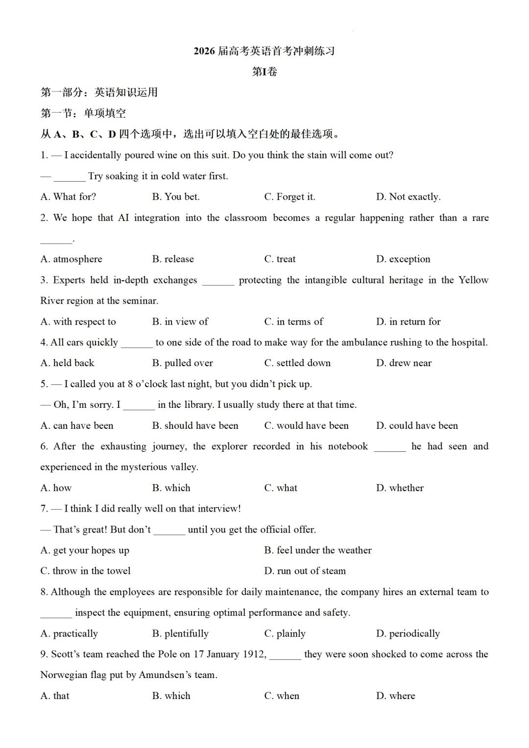 【可打印】天津市南开区南开中学2026届高考英语首考冲刺练习(一)(附解析) 点击上方“蓝字”免费关注! 本套试卷+答案解析下载入口 关注“卿卿侃古今”公众号 点击左下角阅读原文可下载 相关链接: 2007-2025年天津市高考英语真题汇总(持续更新中~) 2011-2023年天津高考英语听力真题在线测试 【高考英语听力在线测试】高考听力机考模拟试题大全(持续更新中) 【可下载】2025-2026年高中英语试题汇总(附解析)【持续更新中】 【汇总】高中英语月考和期中期末试题(持续更新中~) 【题库】高一英语试题汇编(持续更新中~) 【题库】高二英语试题汇编(持续更新中~) 【题库】高三英语试题汇编(持续更新中~) 【可下载】高三英语上学期期末试题16套(附解析) 【可下载】高二英语上学期期末试题10套(附解析) 【可下载】高一英语上学期期末试题汇9套(附解析) 【可下载】2025-2026学年度高一高二高三开学考试模拟试卷(天津专用)(附解析) 新外研版高中英语高清电子课本、课文原文和译文、单元同步复习资料和试题【持续更新中】 【目录1】高中英语阅读理解限时训练大全(持续更新中~) 【目录2】高中英语完形填空限时训练大全(持续更新中~) 【目录3】高中英语书面表达大全(持续更新中~) 【目录4】高中英语听力训练大全(持续更新中~) 【目录5】高中英语单选题大全(持续更新中~) 【目录6】高中英语语法题大全(持续更新中~) 【目录7】高中英语阅读表达题大全(持续更新中~) 【目录8】科普知识汇总 【目录9】中高考学法知识汇总 【目录10】高考英语真题+名校模拟真题+月考和期中期末试题(持续更新中~) 【目录11】暑期高考英语备考资料大全持续更新中~【汇总】中高考志愿填报资料大全 【汇总】高中英语月考和期中期末试题(持续更新中~) 【汇总】2025届高三英语一模试题(附解析) 【汇总】2024届高三英语一模二模三模试题(附解析) 【汇总】2024届高考英语押题卷(附解析) 【汇总】2025届高三英语周考综合练(附解析) 【题库】高三英语限时训练(持续更新中~) 【模拟】2025届高三英语听力机考模拟试题在线测试 【高考词汇】(新)外研版高中英语全七册词汇表(附音频) 【中考词汇】初中英语外研版必备单词表(完整版),可打印 建议收藏保存 点击阅读原文查更多