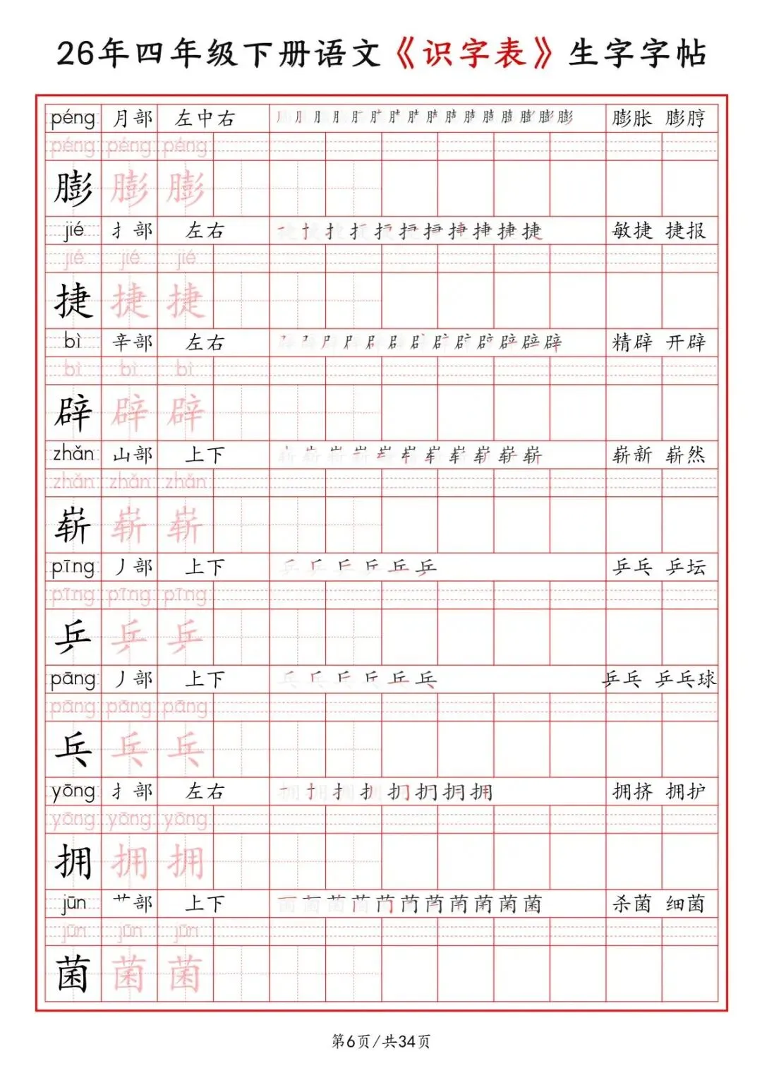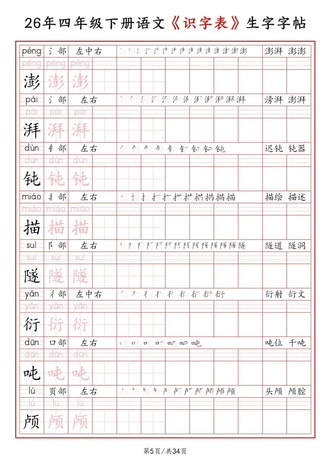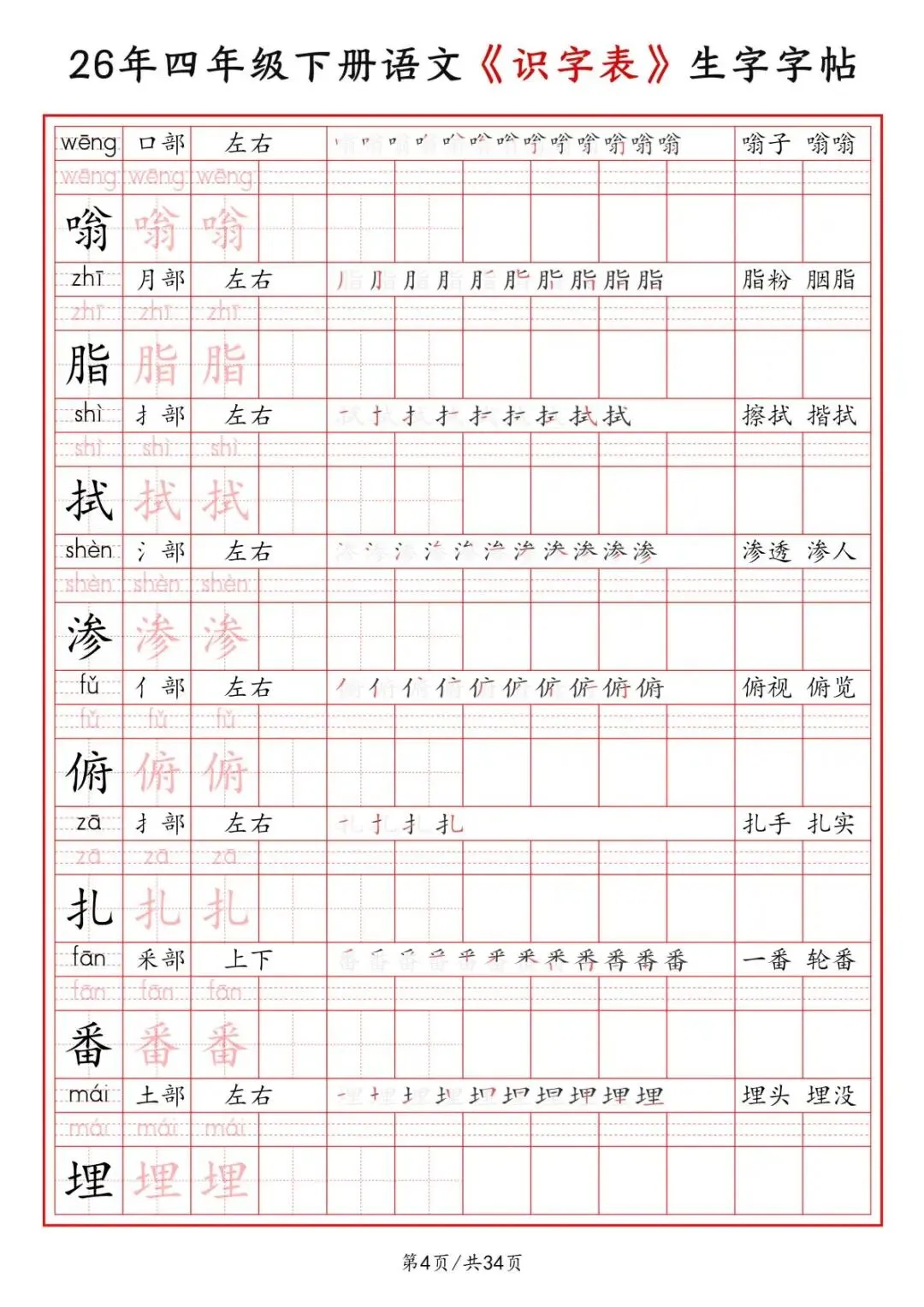 四年级下册语文《识字表》二类字字帖,电子版可打印