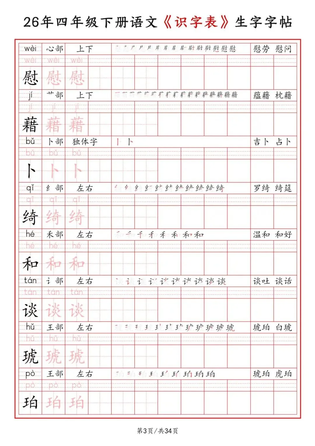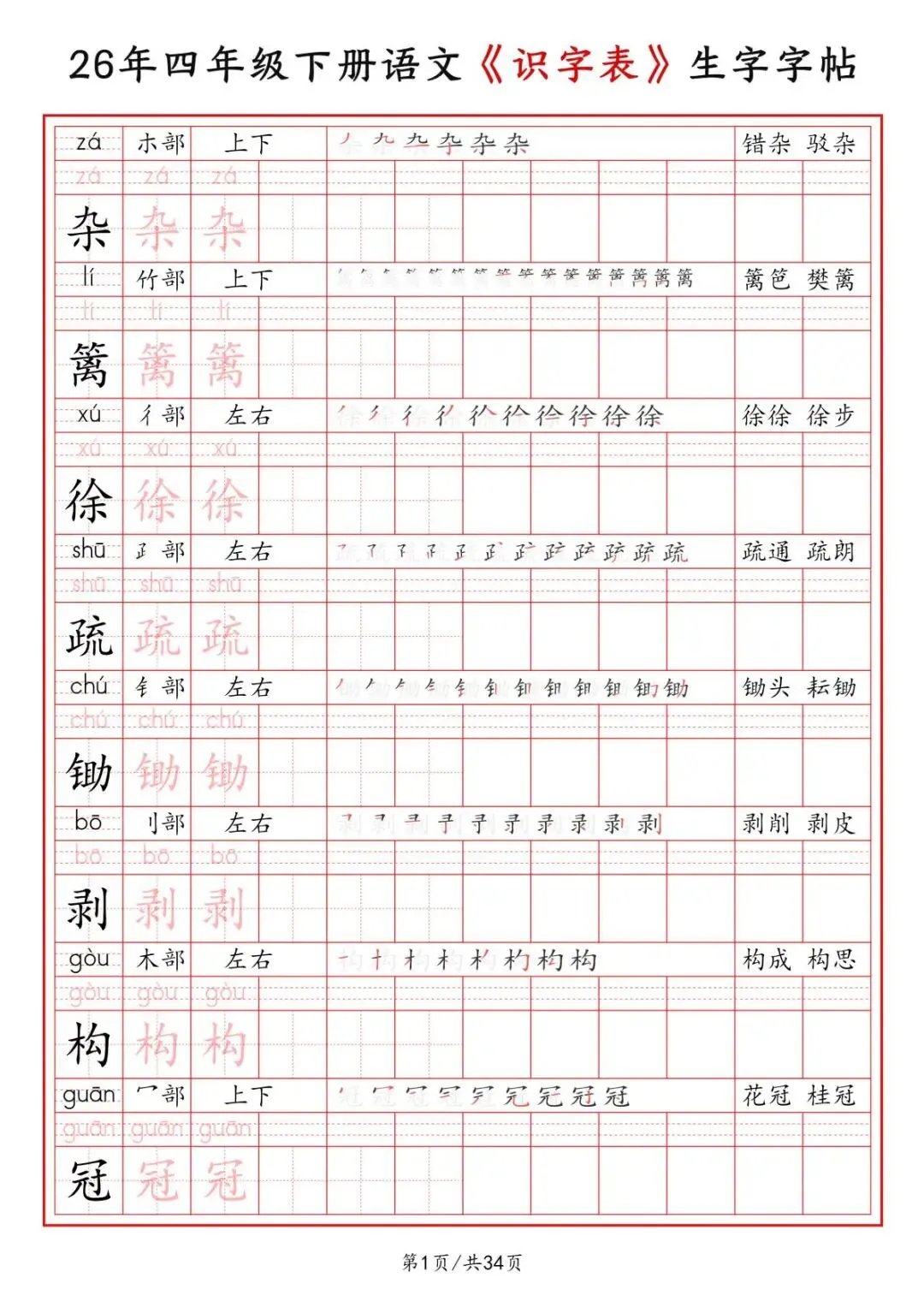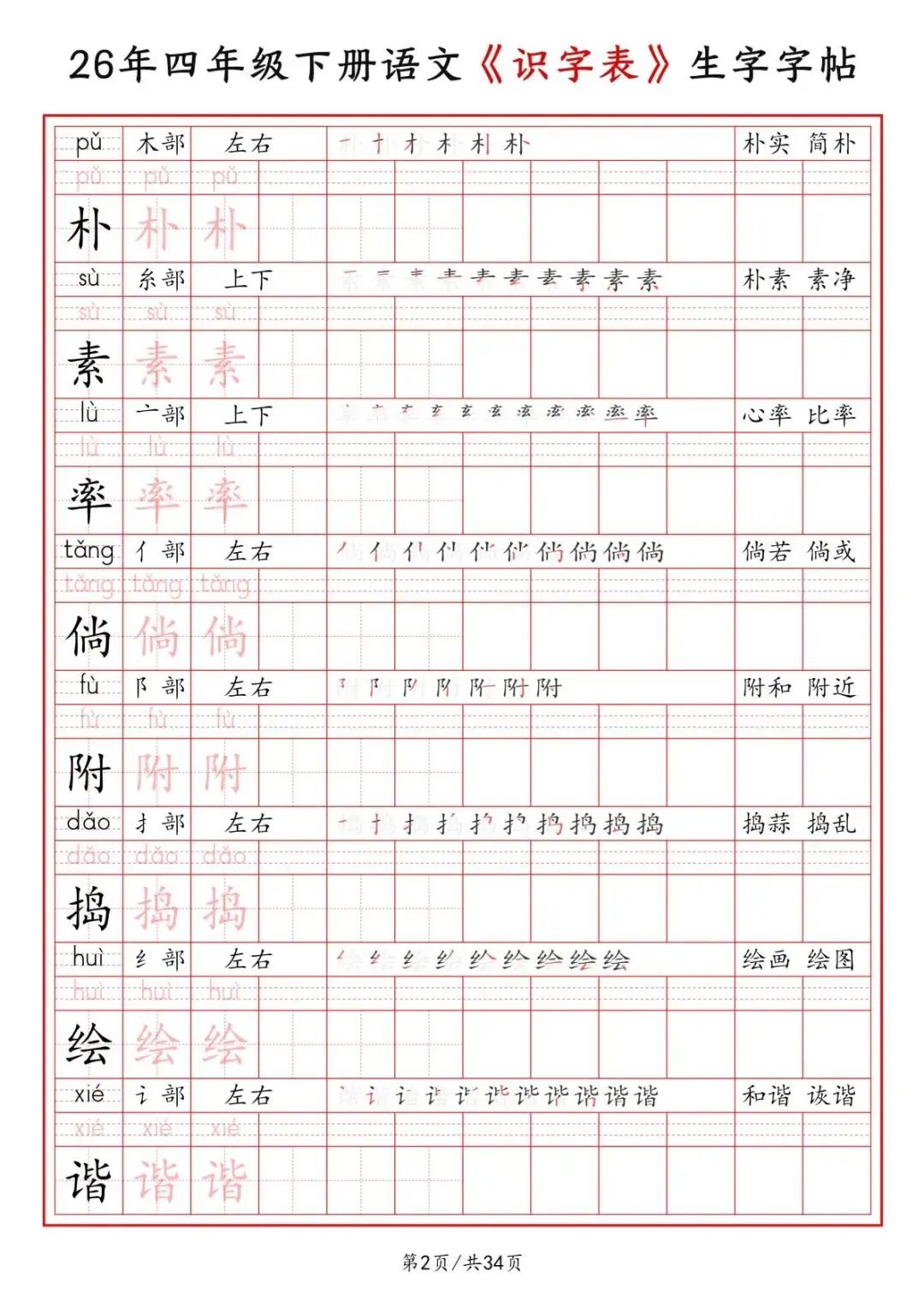 四年级下册语文《识字表》二类字字帖,电子版可打印