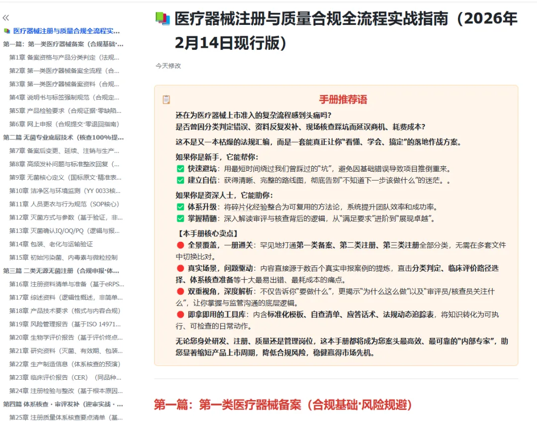 分享一个体系化学习电子版付费资料《医疗器械注册与质量合规全流程实战指南(2026年2月14日现行电子版)》