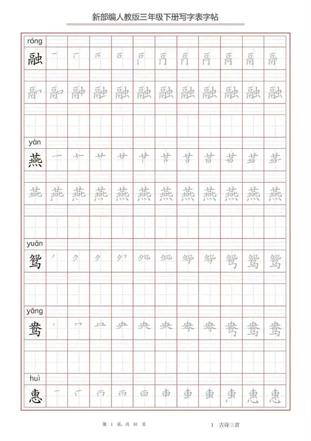 这份是三年级下册语文的写字表电子版,PDF格式的。里面把课本里要求会写的生字都整理好了,像“融、燕、鸳、鸯”这些字都在里面。用的是标准的田字格,排版很清晰,直接打印出来就能用。