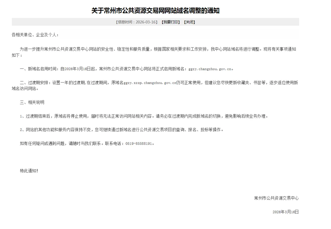 一、新域名启用时间:自2026年3月16日起,常州市公共资源交易中心网站将正式启用新域名:ggzy.changzhou.gov.cn。