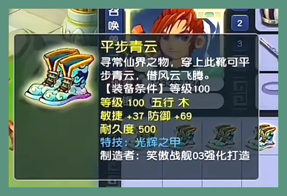 装备特技100级鞋子“平步青云”:敏捷+37、防御+69,带特技“光辉之甲”。