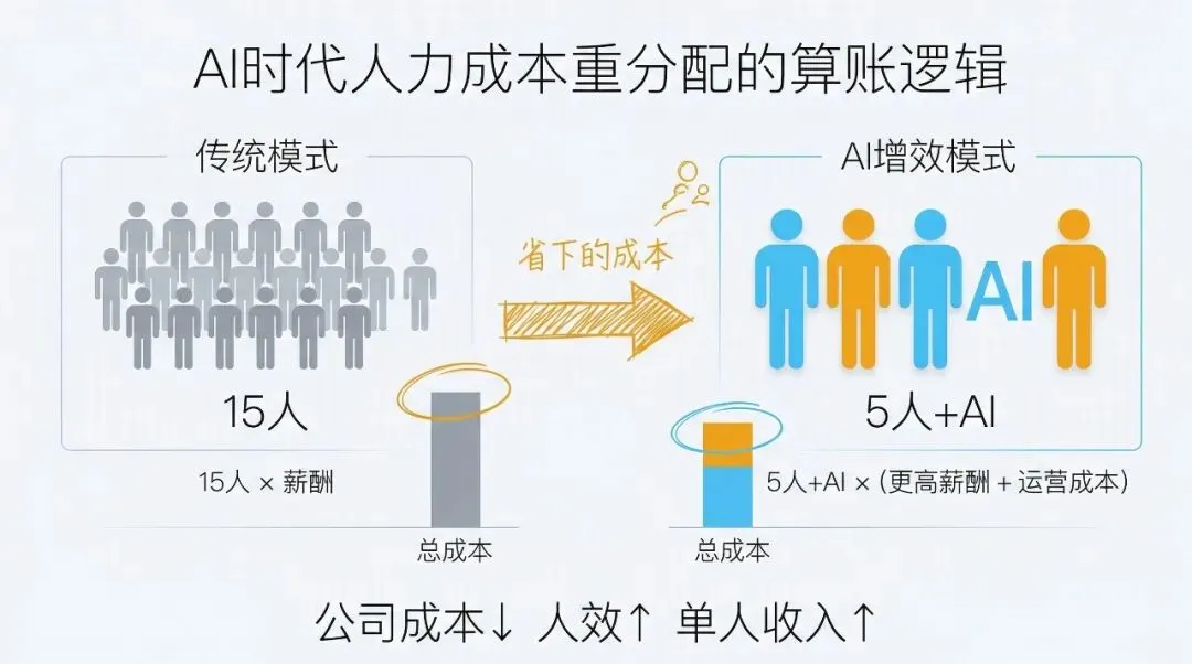 15个人的活,5个人加AI能干完。把省下的人力成本拿一部分出来给留下的人加薪,公司总成本降了,人效翻了,留下的人收入涨了。