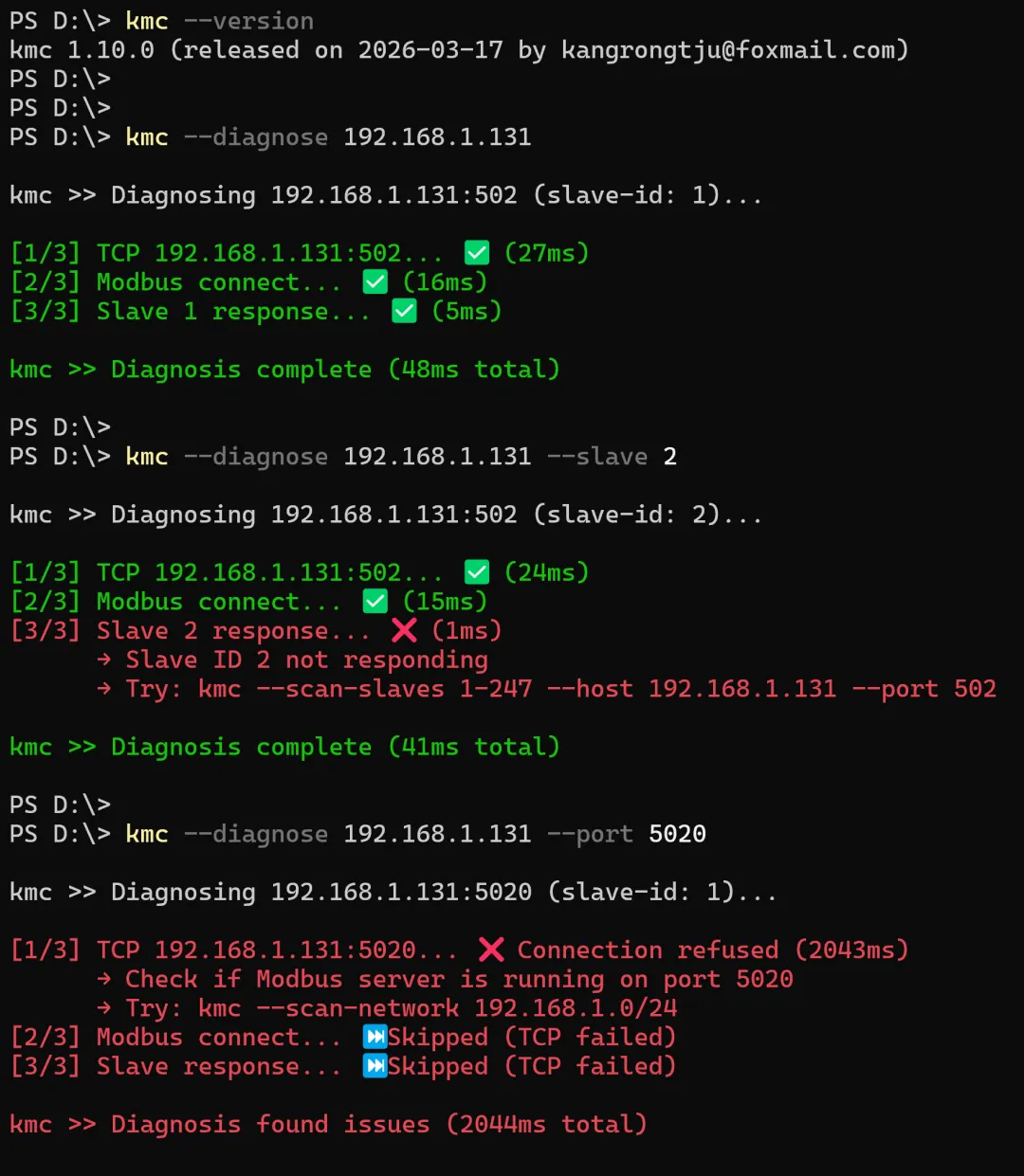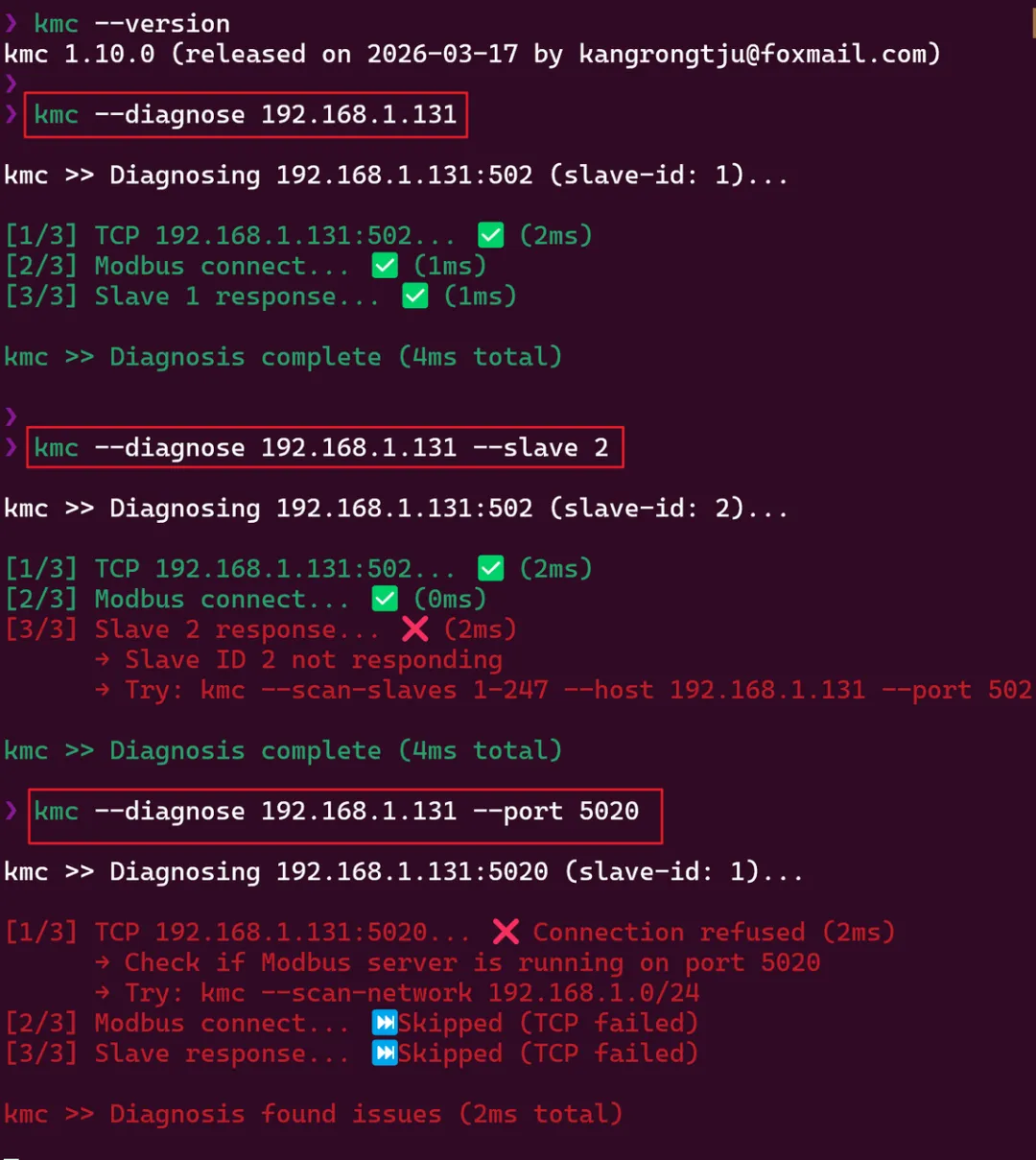 $ kmc --diagnose 192.168.1.131kmc >> Diagnosing 192.168.1.131:502 (slave-id: 1)...[1/3] TCP 192.168.1.100:502... ✅ (2ms)[2/3] Modbus connect... ✅ (1ms)[3/3] Slave 1 response... ✅ (1ms)kmc >> Diagnosis complete (4ms total)