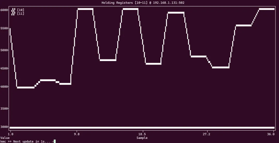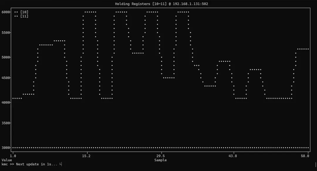 终端里实时渲染 ASCII 折线图,支持多个寄存器多条线,自适应终端屏幕大小,动态刷新。数据变化趋势,一眼就看出来。适合这些场景: