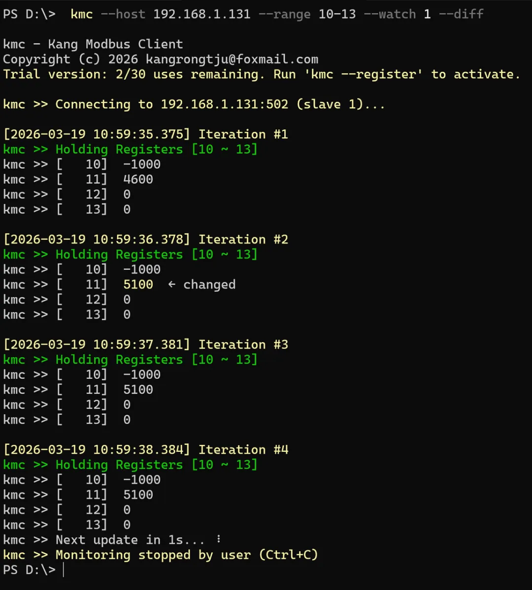 Modbus 命令行调试神器 kmc v1.10.0发布:一键诊断连接问题,直观感受数据变化