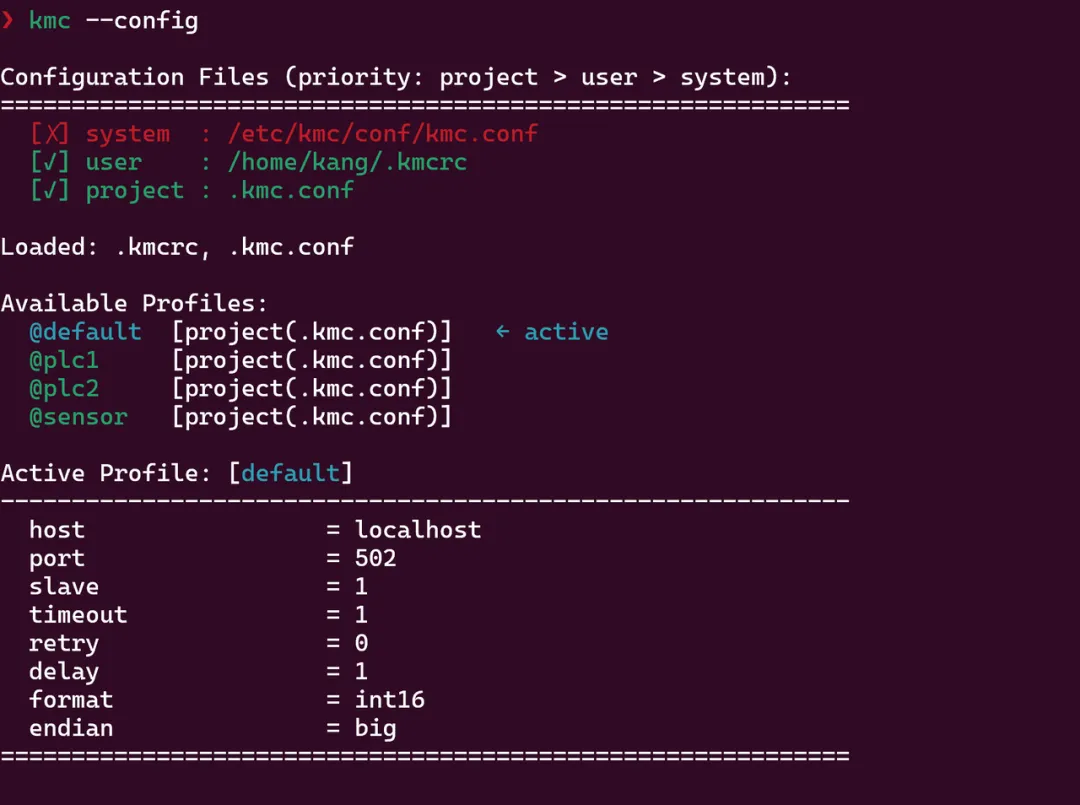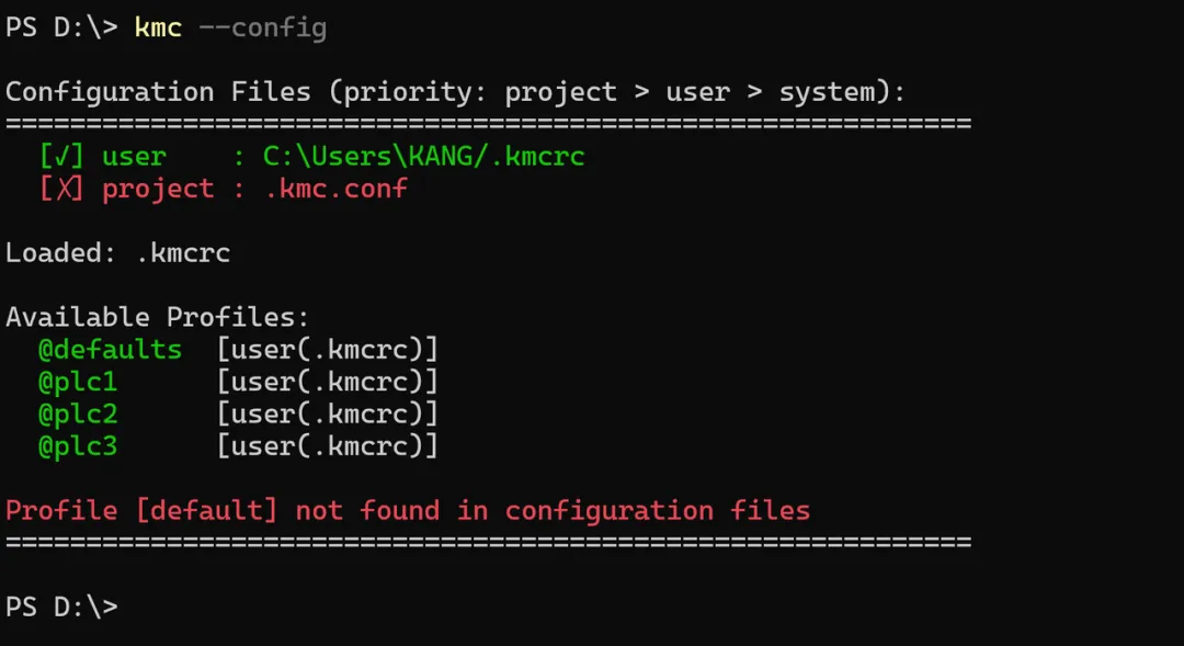 kmc --config # 显示配置(默认)kmc --config show # 同上kmc --config init # 初始化用户配置kmc --config init all # 初始化所有级别