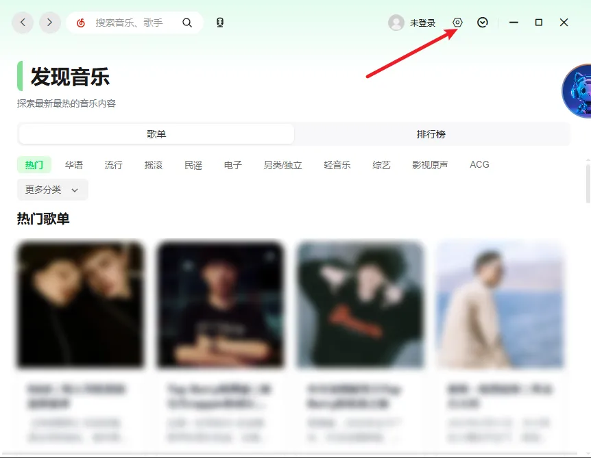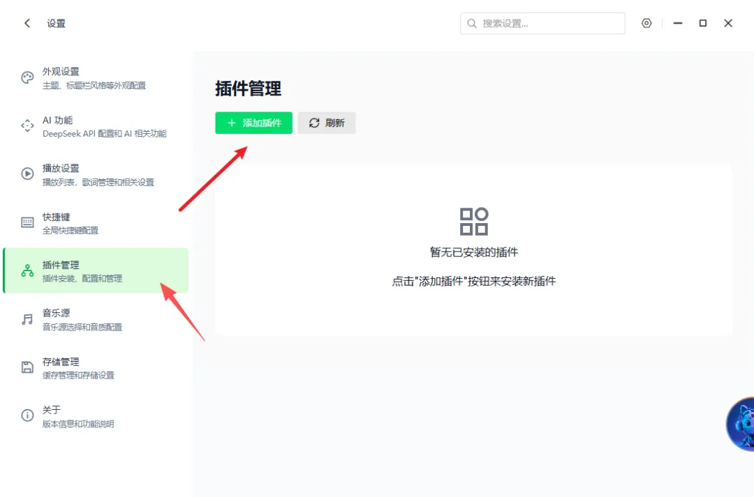因为这是一个音乐播放器,首次使用需要配合插件。点击右上角的齿轮图标按钮进入设置界面,