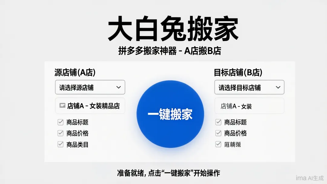 今天就给大家介绍一款能把这些麻烦全解决的拼多多搬家神器——大白兔搬家,它主打**“A店搬B店一键操作+商品属性完整迁移+类目智能匹配”**,把“人工搬运”变成“系统秒迁”,跨店效率直接拉满,还能100%保留商品“灵魂信息”,让新店快速“复制成功”。