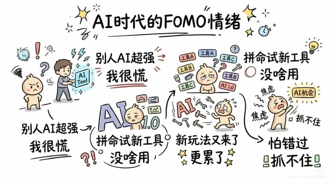 这种焦虑有个名字,叫FOMO(Fear Of Missing Out)——害怕错过。AI越火,这种焦虑越强:别人都在用了,我是不是已经落后了?