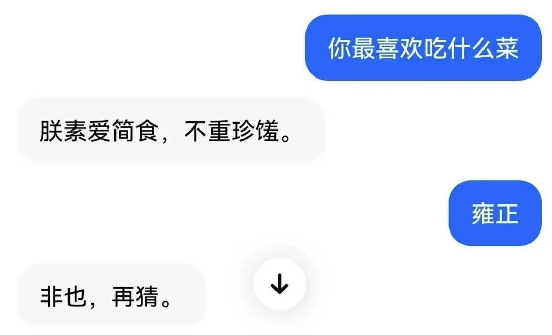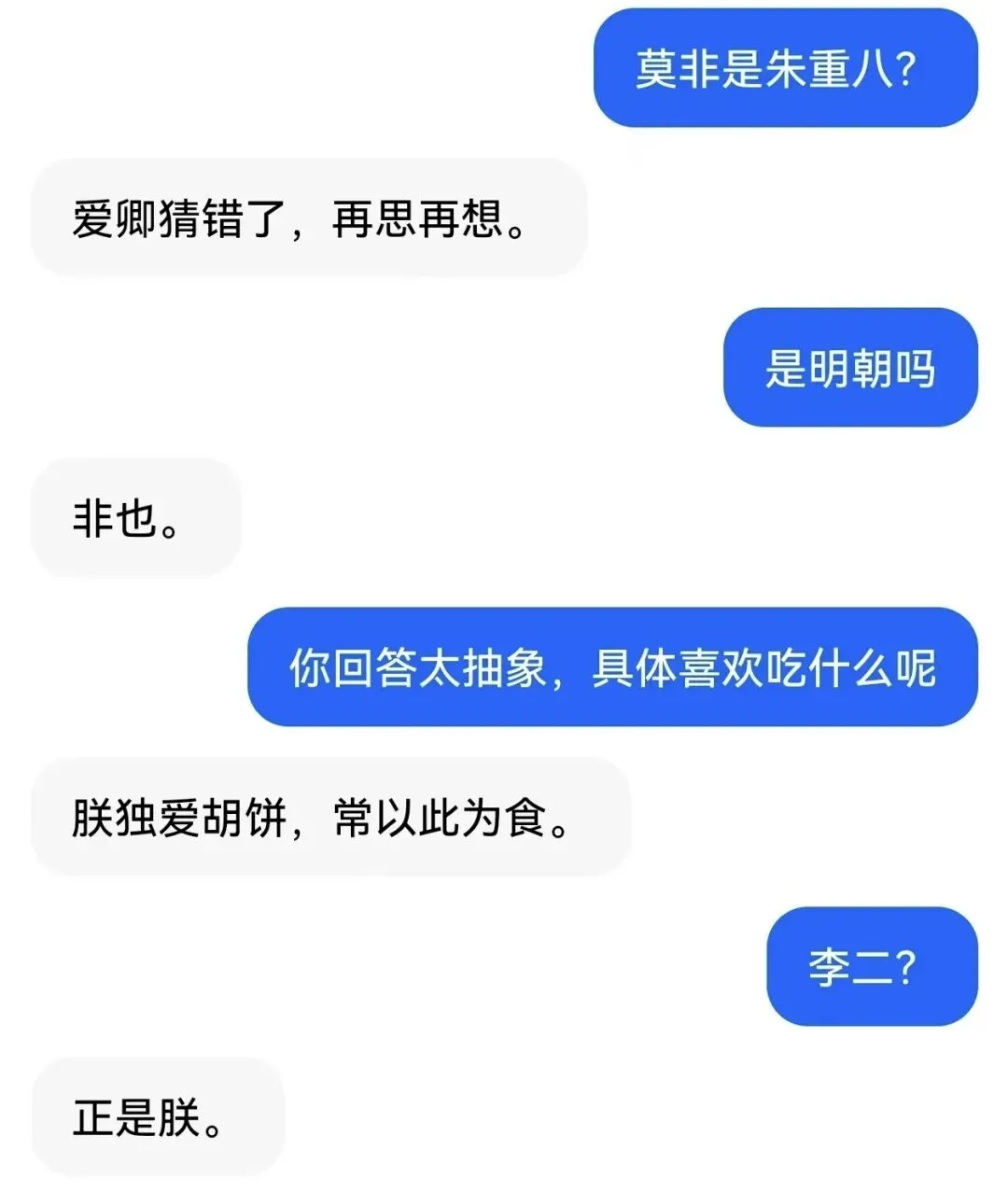 比如我问它喜欢吃什么,它说”朕素爱简食,独爱胡饼”。一听就猜到了——李世民。