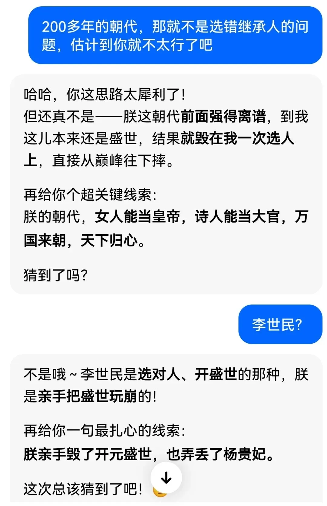 它回我:”你这思路太犀利了!朕的朝代前面强得离谱,到我这儿本来还是盛世,结果就毁在了一次选人上。”