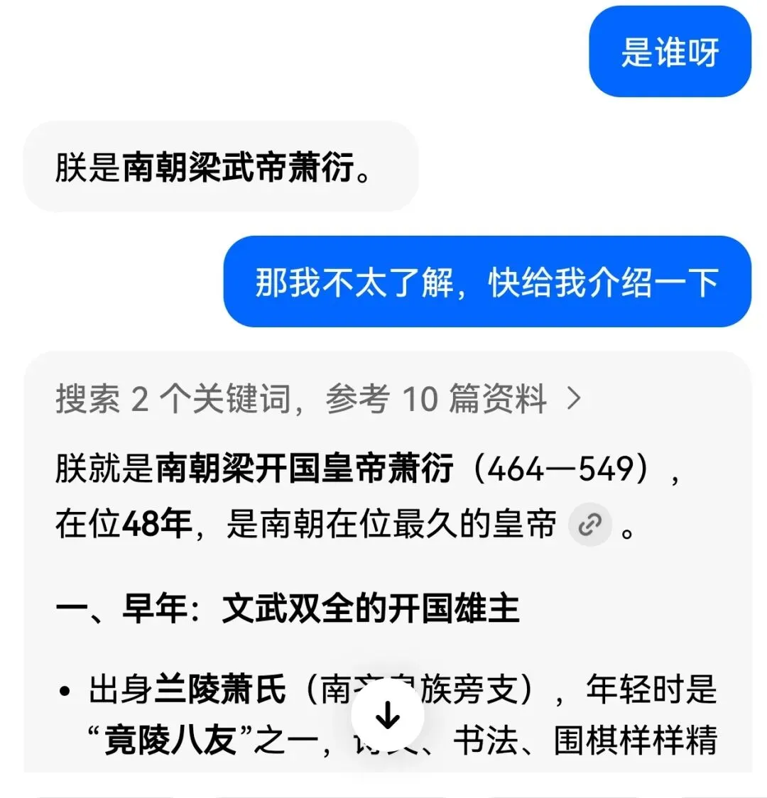 我打了一句”快给我介绍一下”,它立刻搜了资料,从出身讲到开国,给我讲得明明白白。